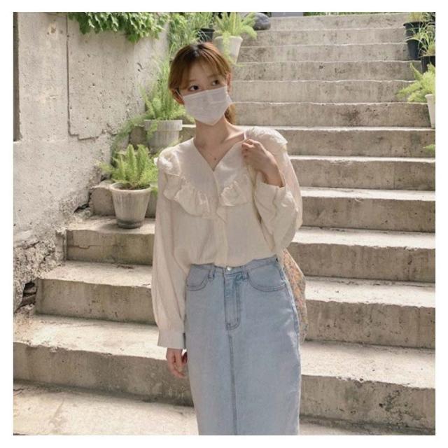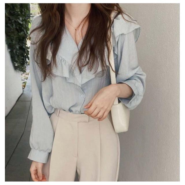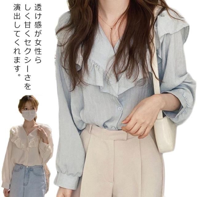 レディース ブラウス ボリューム袖 フリルシャツ フリル 送料無料 パフスリーブ チュール 通学 フェミニン 長袖 フリル襟 可愛い Vネック 大人 女性 トップス デート セクシー カジュアル 透け感