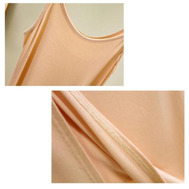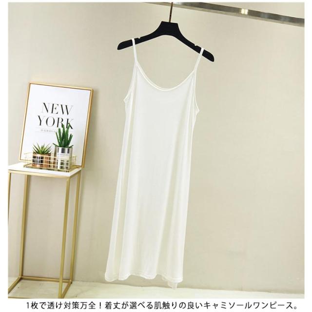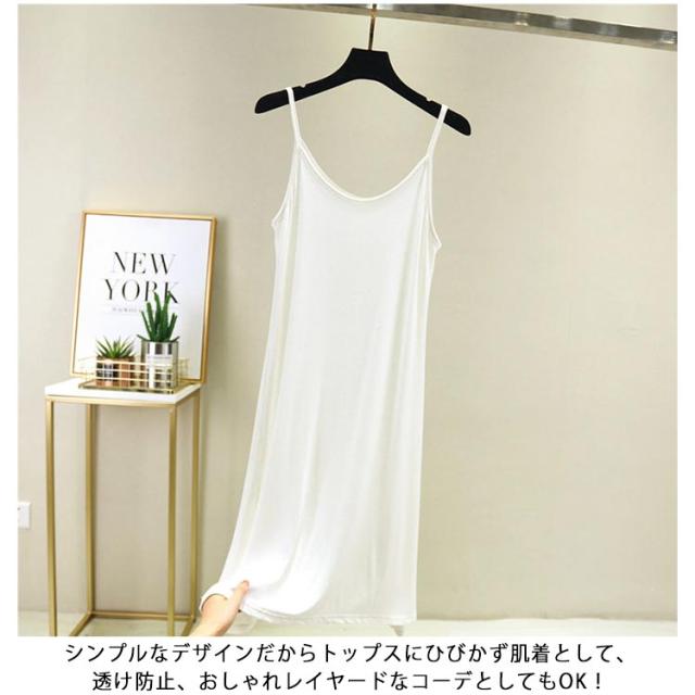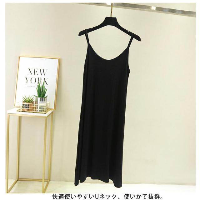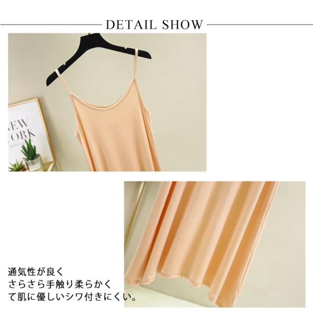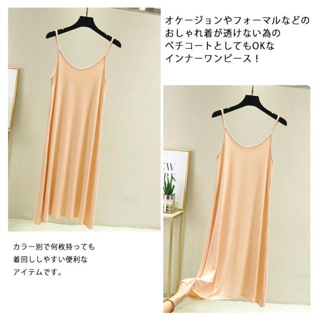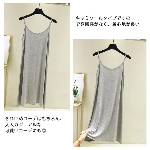 | 長い季節着まわしやすい、ベタつかないインナーキャミワンピース。 シンプルなデザインだからトップスにひびかず肌着として、透け防止、おしゃれレイヤードなコーデとしてもOK! 通気性が良くさらさら手触り柔らかくて肌に優しいシワ付きにくい。 カラー別で何枚持っても着回ししやすい便利なアイテムです。 | |