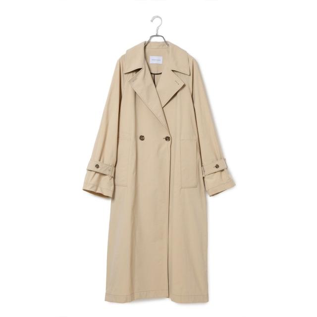 削ぎ落されたデザインの洗練されたミニマルなトレンチコート。ダブルフロントの釦と衿元釦のみのデザインで、大き目な衿と太目なポケット、太目なウエストベルトがポイント。
