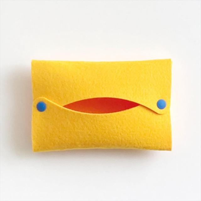 ポケットティッシュケースの新作。新しい本体カラーとカラフルなスナップボタンが特徴で個性的なラインアップ。1枚のフェルトを折りたたみスナップボタンでとめることによりフェルトの力でできたカタチ。手の中でふくらむような心地よいボリューム感。ティッシュをセットし易く、取出し易い機能、そして清潔を保つようウォッシャブルフェルトを採用。意匠登録 1483650