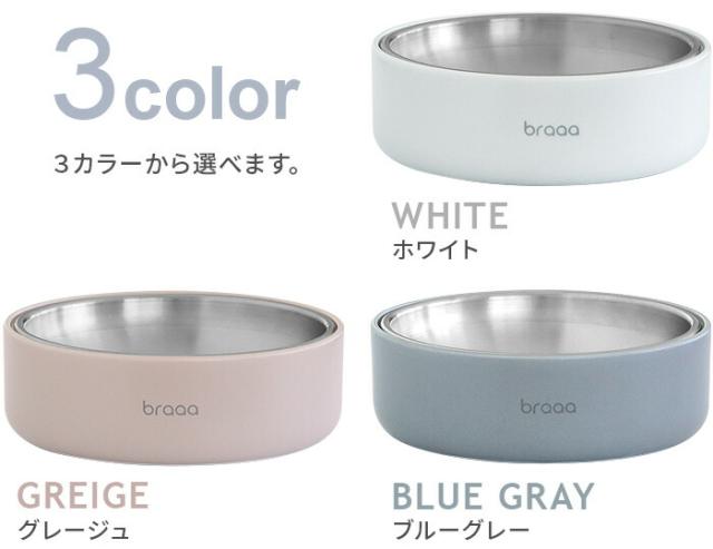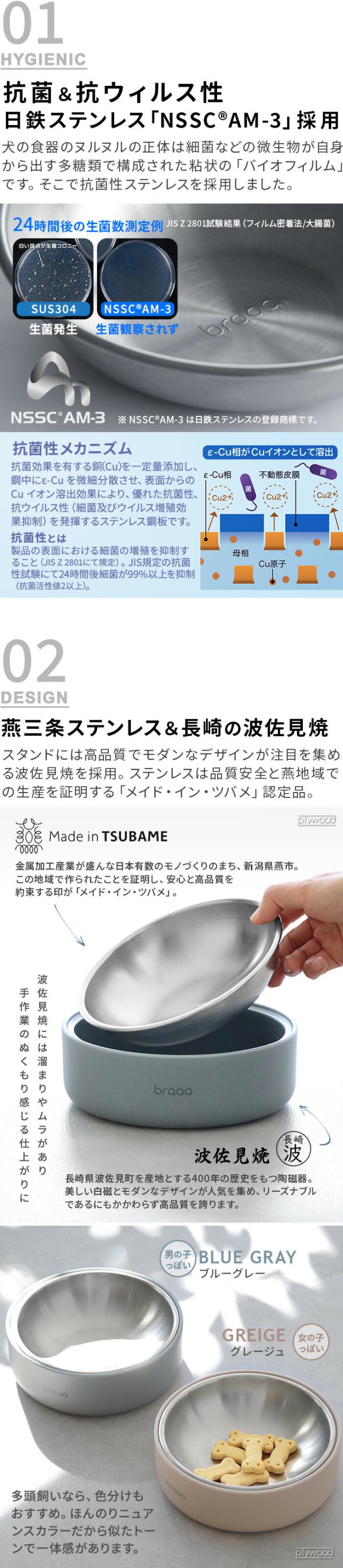 無駄をそぎ落としたミニマルデザインが魅力のブランド braaa(ブラー)より、抗菌素材のペット用フードボウルのご紹介です。犬の食器がヌルヌルしているという経験をされた方は多いのではないでしょうか?このヌルヌルの正体である細菌の増殖を抑制するために、特殊な抗菌ステンレス皿を採用。燕三条の高品質なステンレスで犬の口内環境や健康管理のために清潔な状態を保ちましょう。また、合わせた陶器製スタンドはやきものの町、長崎県波佐見町のもので、置いてある佇まいも雰囲気があります。