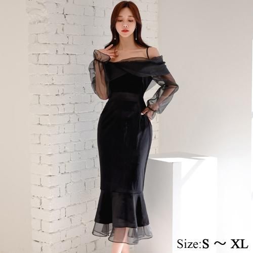 【グラシア】 キャバ ドレス キャバドレス ワンピース ミディアムドレス エレガント オフショル シフォン デコルテ ベロア 光沢 すっきり ドレッシー 軽やか ブラック S M L XL