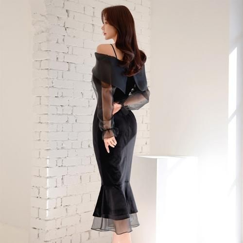 ベロアとシフォンのボリュームが軽やかに美しいマーメイドミディ丈ワンピです。