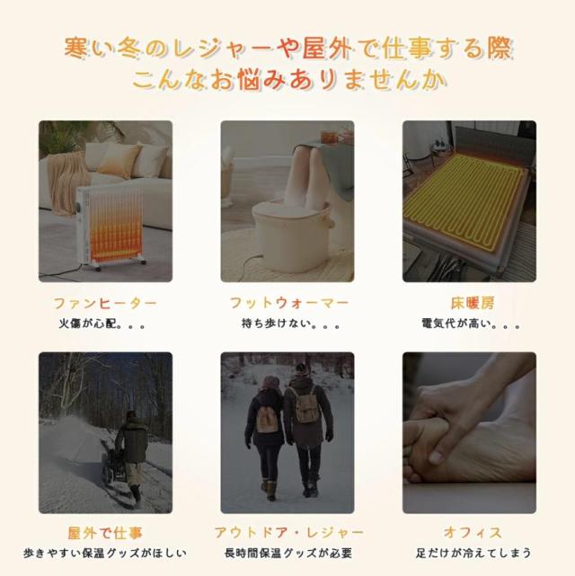 【4段階で温度調節可能】 シーンによて段階を調整し、バイク、スキー、登山など野外の寒い環境で足元をしっかり温め、日常的な通学、通勤、寒い場所での仕事や作業、出張などにも使用できます。アウトドア愛好家、アウトドアワーカー、お年寄りの方に全力おすすめです。