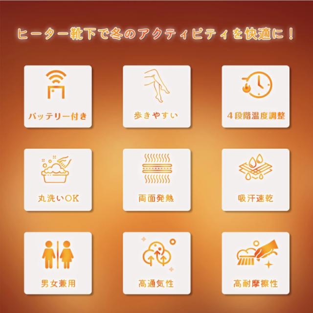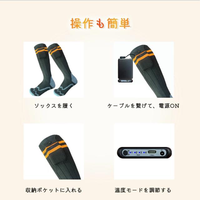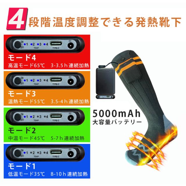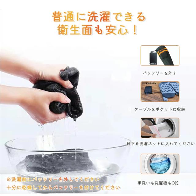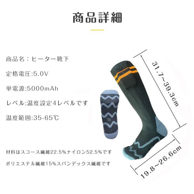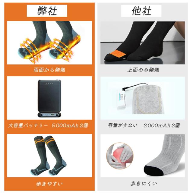 【充電式&5000mAh大容量*2】5000mAh*2充電式リチウムバッテリーを内蔵されて、フル充電で3〜10時間の動作が可能。長時間の外出に最適です。また最新赤外線発熱シートを使って、加熱シートは靴下の上に内臓、履き心地に異物感などの不快感はありません。さらに改良USBケーブルは耐久性が良く使用寿命が長いです。