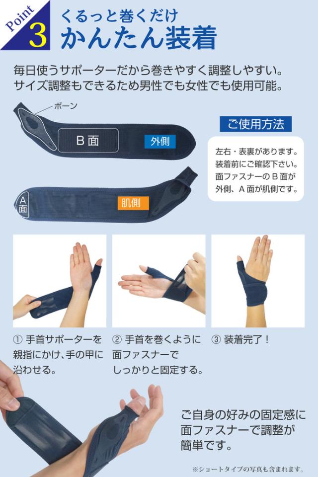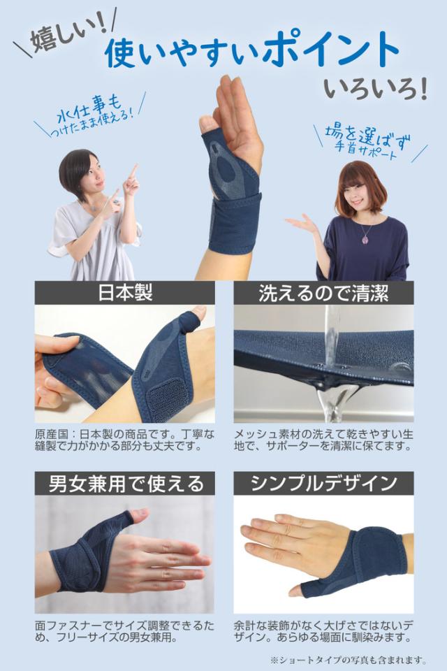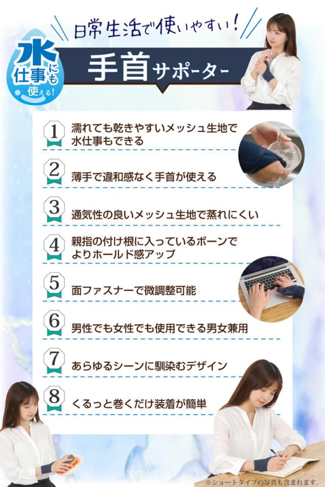 - つけたまま手を洗えると書いてあるが、手を拭いてすぐ乾くわけではないので外して手洗いしてます。 洗濯したあとは乾きが早いです。 ロングで思ったより長かったので、ショートも追加で購入しました。 程よいサポ...