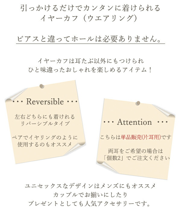 | 注意点 | ◆片耳用のため、1点でのお届けになります。 ◆代金引換決済・日時指定はご利用いただけません。 ◆細かい傷や凹凸が見られる場合がございます。表記サイズは計測方法やロットにより多少の誤差が生じる場合がございます。お使いのモニター環境により画像と色の見え方が異なる場合がございます。予めご了承ください。 ◆ステンレス素材の商品は多少のサイズ調整が可能です。ただし無理なサイズ調整は変形の原因になります。少しずつサイズを確認しながら行ってください。 ◆耳の形状等により、装着出来る位置が異なる場合がございます。 |