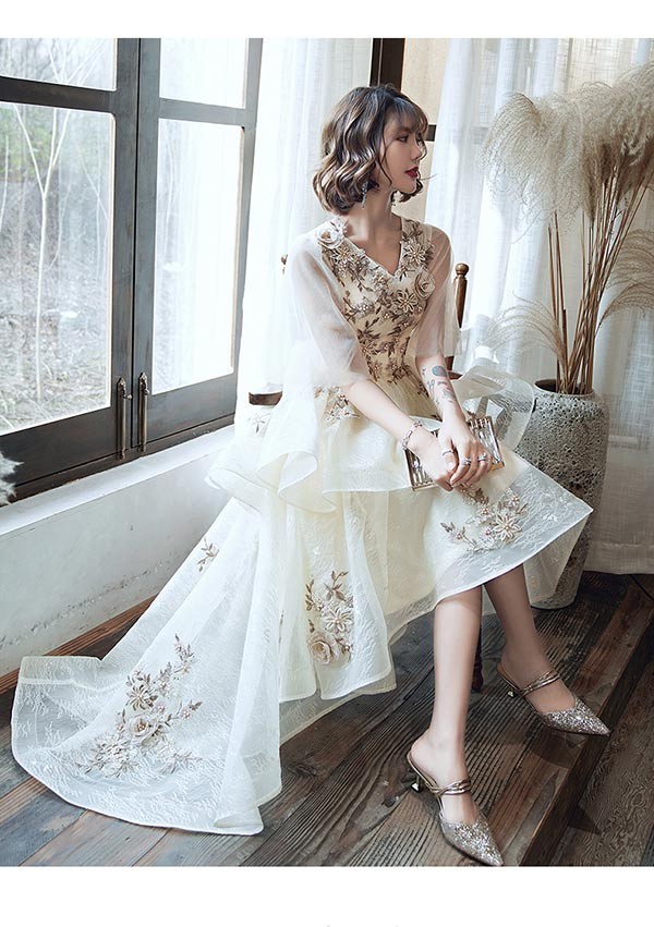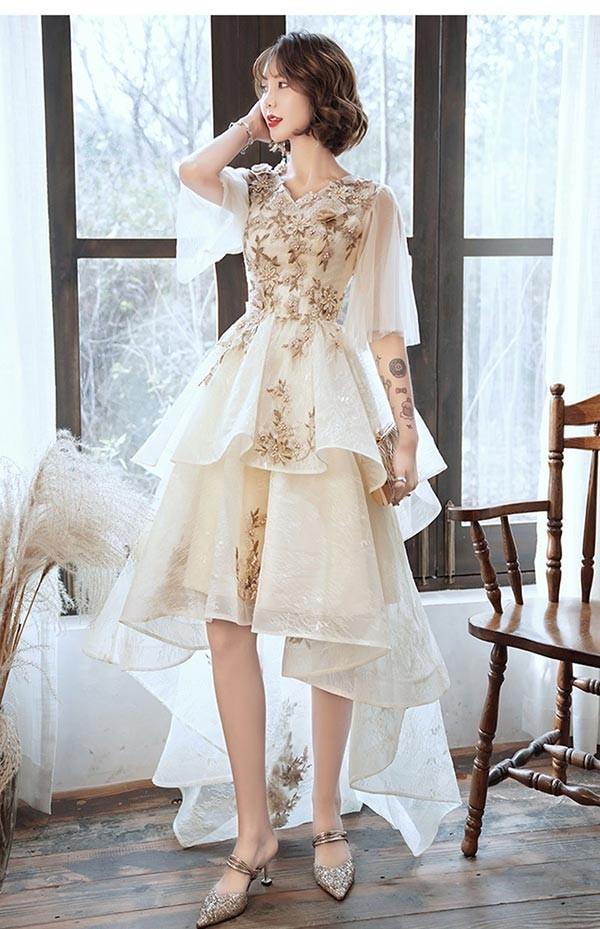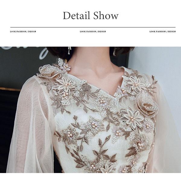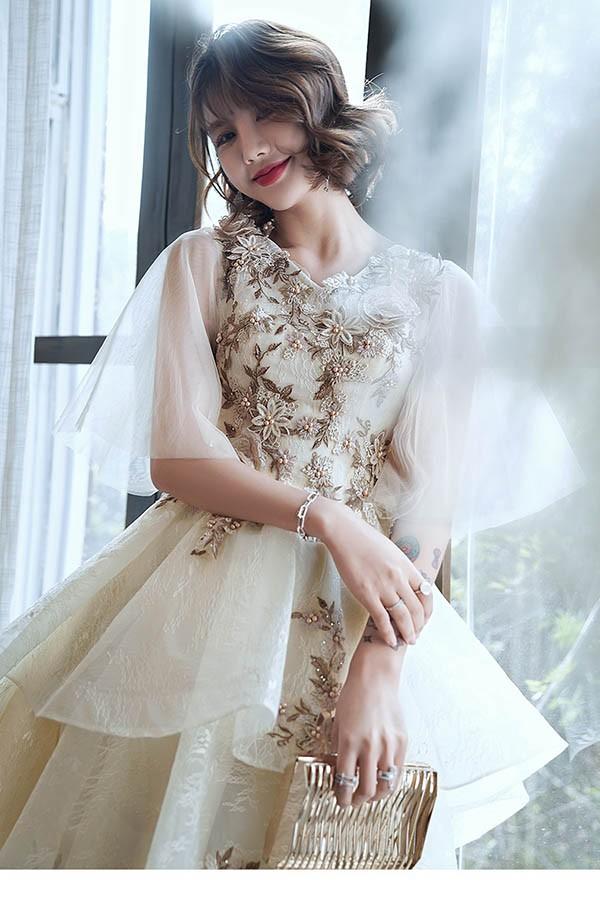 フィッシュテール ドレス ピアノ 発表会 ショート丈 ひざ丈ドレス Vネック フレアスリーブ 半袖あり 豪華レース刺繍 ファスナー パーティードレス ウエストリボン カクテルドレス 演奏会 結婚式 母親 ドレス フォーマル 小さいサイズ 大きいサイズ ベージュ da216x1x1d7