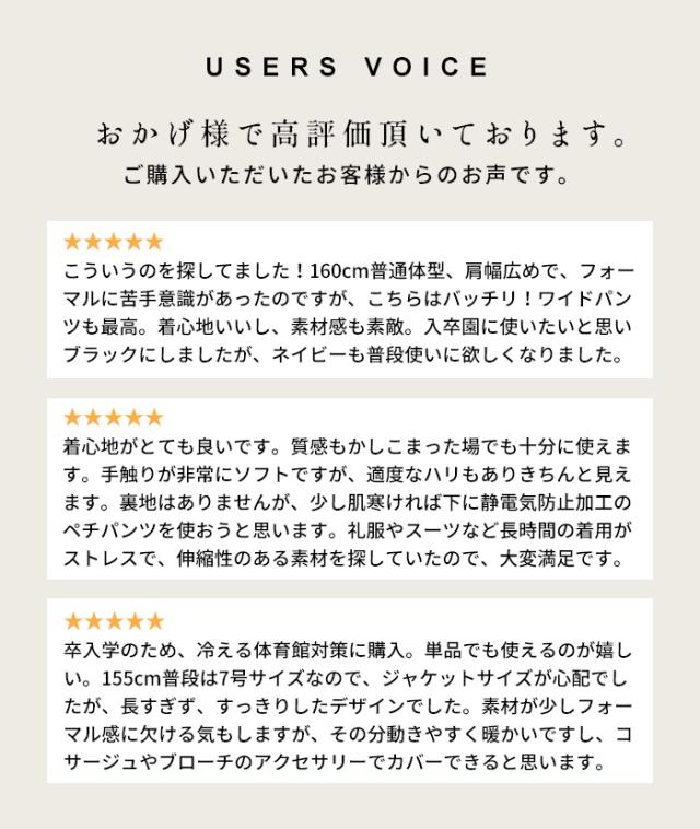 特徴 私たちは、きちんと感を演出しながら、デイリーに使えて、着回しがきくフォーマル服を作っています。上質な素材と定番のデザインであれば、パールやコサージュなど少しの小物を上手に身に着けるだけで、大人のフォーマル顔に仕上がります。ウールの産地尾州でと特注した圧縮ウールは、抜群の伸縮性で、フォーマルな場もデイリーもストレスフリーな着心地です。