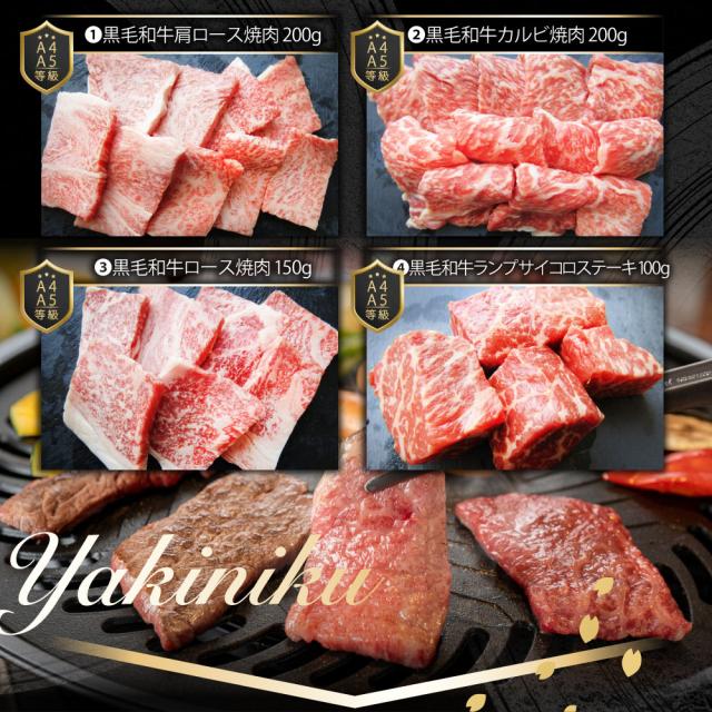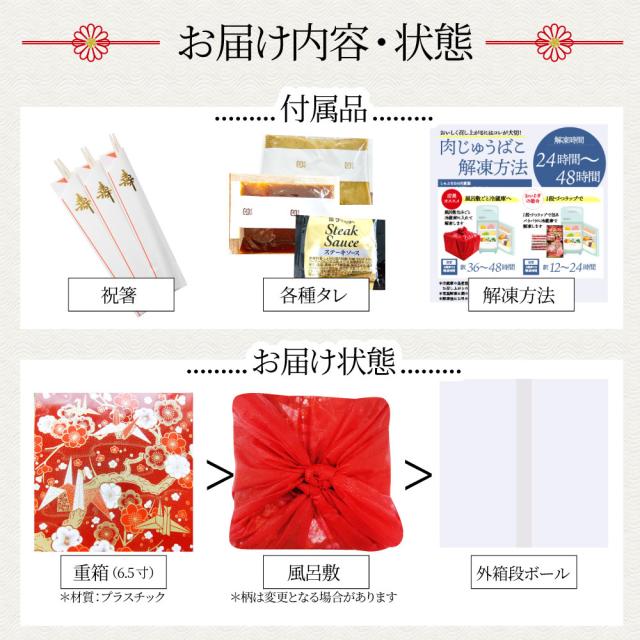 黒毛和牛ロースステーキ270g●黒毛和牛肩ロース焼肉200g●黒毛和牛カルビ焼肉200g●黒毛和牛ロース焼肉150g●黒毛和牛ランプサイコロステーキ100g●焼肉のタレ30g×4●祝い箸3膳