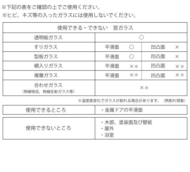 | 注意事項 | 使用できるところ 透明板ガラス、すりガラスの平滑面、型板ガラスの平滑面、金属ドアの平滑面 使用できないところ すりガラスの凹凸面、型板ガラスの凹凸面、網入りガラス、複層ガラス、合わせガラス ※温度差変化でガラスが割れる場合があります。(熱割れ現象) ※ヒビ、キズ等の入ったガラスには使用しないでください。 木部・塗装面及び壁紙、屋外、浴室 |