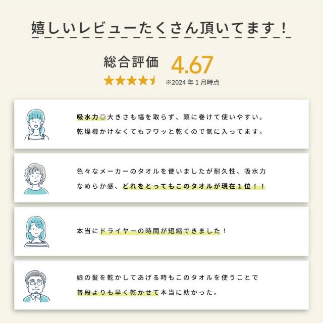 フェイスタオル感覚で使え、髪全体を包み込みやすく、ロングヘアの方にもおすすめです!