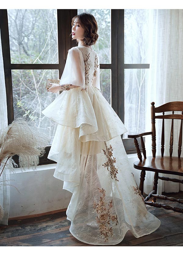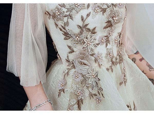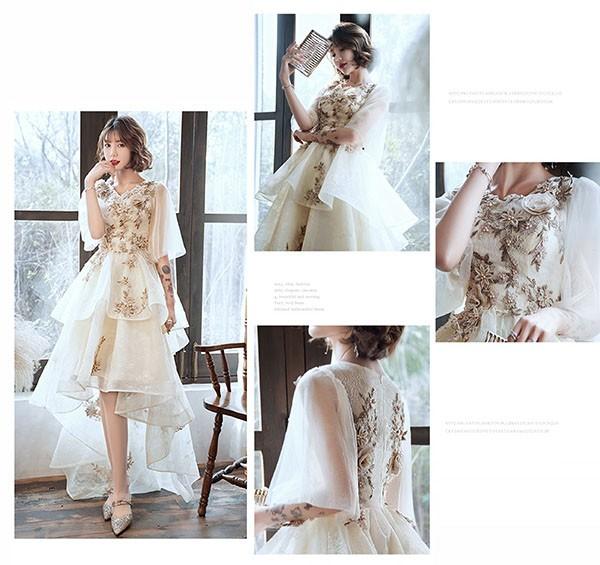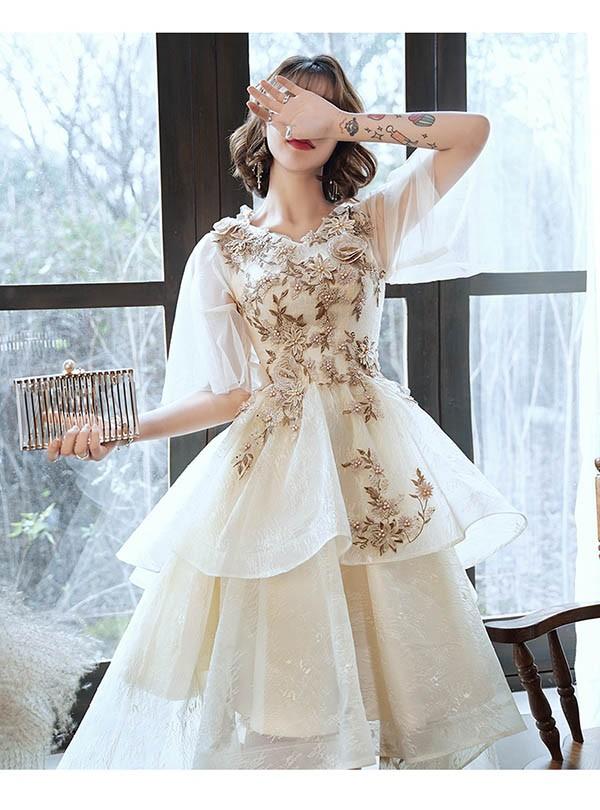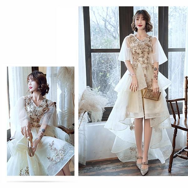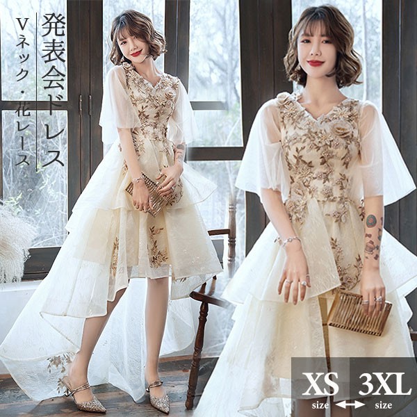 フィッシュテール ドレス ピアノ 発表会 ショート丈 ひざ丈ドレス Vネック フレアスリーブ 半袖あり 豪華レース刺繍 ファスナー パーティードレス ウエストリボン カクテルドレス 演奏会 結婚式 母親 ドレス フォーマル 小さいサイズ 大きいサイズ XS S M L XL 2XL 3XL ベージュ da216x1x1l9