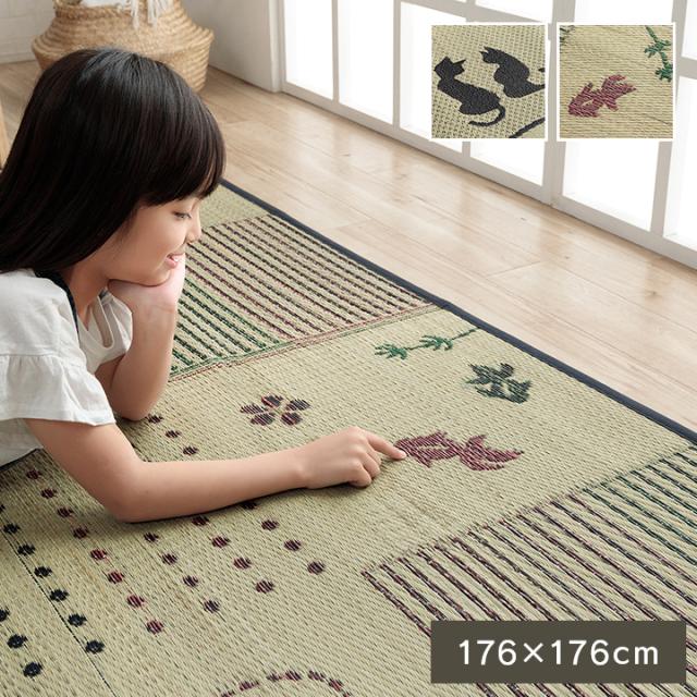 ラグ 2畳 い草ラグ ござ 猫柄 カーペット 「 DXクロネコ DX金魚 」176×176cm 正方形 かわいい おしゃれ い草 夏ラグ ねこ ネコ 猫 金魚 夏 ござ フローリング