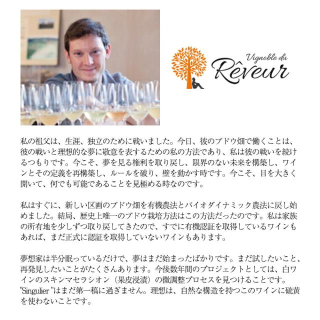 「ドメーヌ・マルセル・ダイス」の現当主ジャン・ミッシェル・ダイスの長男で、2007年より同ドメーヌの醸造を担当しているマチュー・ダイスが、伯父(実母クラリス・ミシュレの兄カシアン)の畑を継承して誕生したドメーヌです。カシアン・ミシュレも1999年からビオロジー栽培を実践していましたが、2012年のマチューの継承と同時にビオディナミに転換し、厳しい収量制限なども含めて「ダイス流」の栽培が開始されました。 醸造を「マルセル・ダイス」の醸造所で行うようになった2013年が事実上のファーストヴィンテージで、新ドメーヌ名「ヴィニョブル・デュ・レヴール(「夢見る者のぶどう畑」)」のラベルにて、2015年に発売が開始されました。「マルセル・ダイスのワインはテロワールのワインであり、長期熟成型のグラン・ヴァンです。対してヴィニョブル・デュ・レヴールのワインは、より若いうちから楽しまれることをイメージして造っています。 ーワードに、これまでアルザスでは行われていなかった醸造法なども積極的に取り入れていきます。例えば今回「サンギュリエ」に採用したマセラシオン・カルボニックがそうですし、アンフォラによる醸造も行う予定です。ぜひ楽しみにしていてください」(マチュー・ダイス)。 | ![]() ■ぶどう品種:ピノ・グリ50%、ゲヴュルツトラミネール50% ■発酵・熟成:アンフォラで6ヶ月間マセラシオン ■樹齢:約40年 ■土壌:沖積土壌 ■栽培:ビオディナミ(デメテール認証&ユーロリーフ認証) ■残糖:ゼロ(辛口) アルザス・オレンジワイン・辛口愛好家大注目!自然派ビオディナミ(デメテール認証&ユーロリーフ認証)のアルザス・オレンジワイン愛好家大注目! 樹齢約40年の古木から収穫されたぶどうは、沖積土壌で栽培されており、これがワインに独特の風味を与えている。ビオディナミ認証を受けた栽培方法は、環境に配慮しつつも、ぶどうの質を高めるための厳しい基準を満たしている。また、アンフォラでの6ヶ月間のマセラシオンにより、ワインはその特有のオレンジ色と独特の香りを帯びる。 残糖ゼロの辛口であり、その味わいは洗練されており、深みがある。ヴィニョブル・デュ・レヴールの0.3haの小さな畑から生まれたこのワインは、フランス・アルザス地方の伝統と革新が融合した逸品である。 |