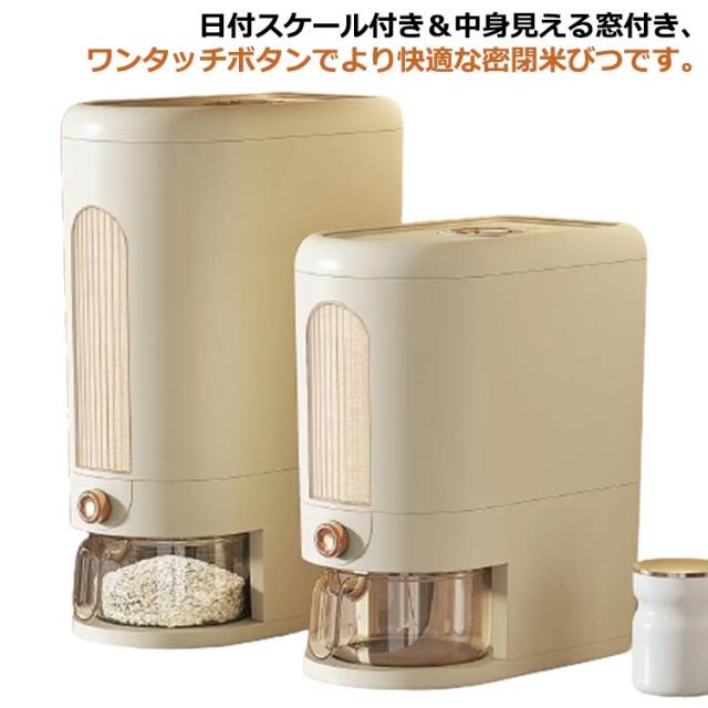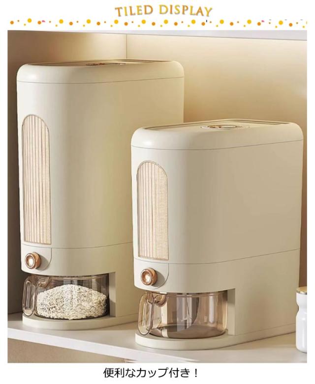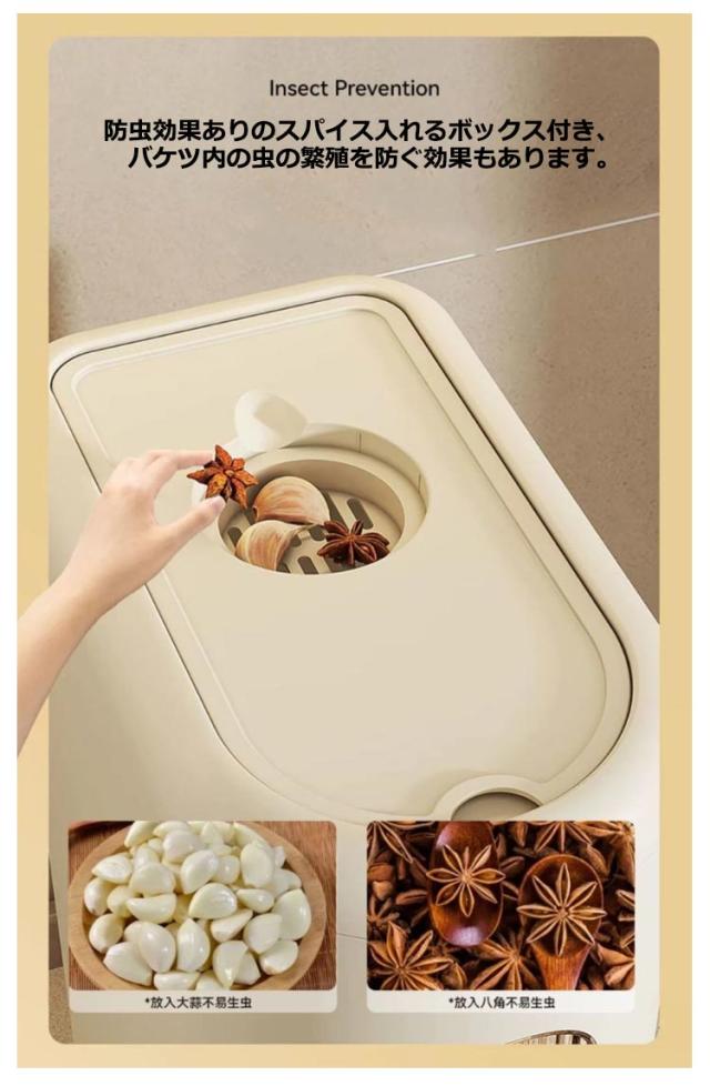 | 日付スケール付き&中身見える窓付き、ワンタッチボタンでより快適な密閉米びつです。 便利なカップ付き! 防虫効果ありのスパイス入れるボックス付き、バケツ内の虫の繁殖を防ぐ効果もあります。 健康な使い方をするための厳選素材材質は食品用PPを採用し、高温に強く、より耐久性があります。 湿気を効果的に防ぐ、ベースは埃や水蒸気に対して密閉されています。 | |