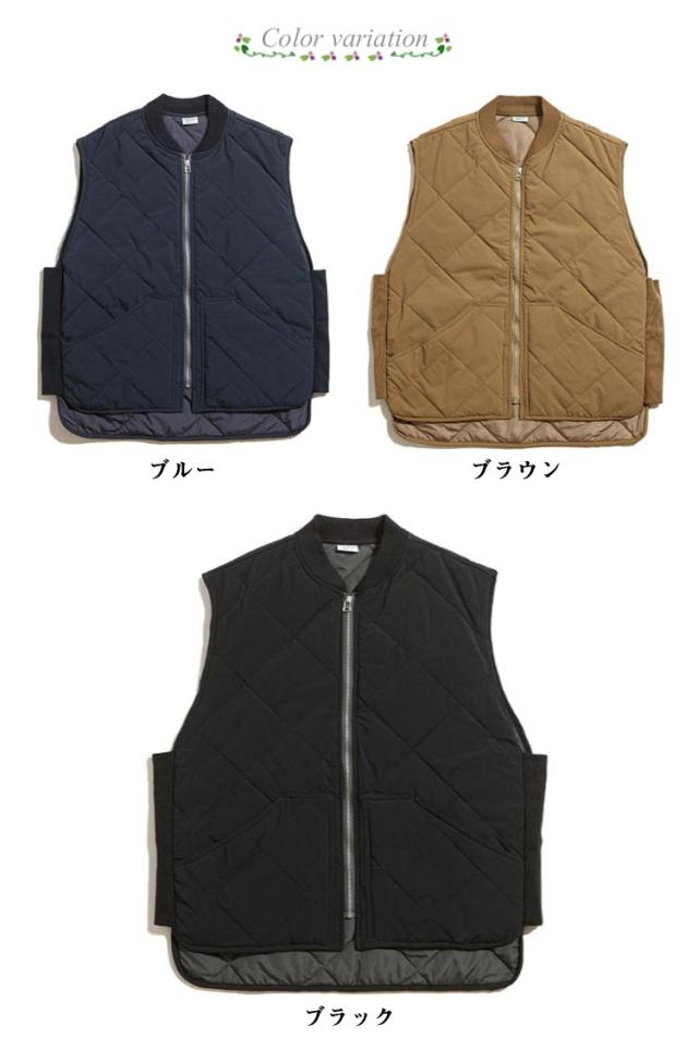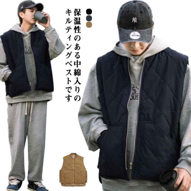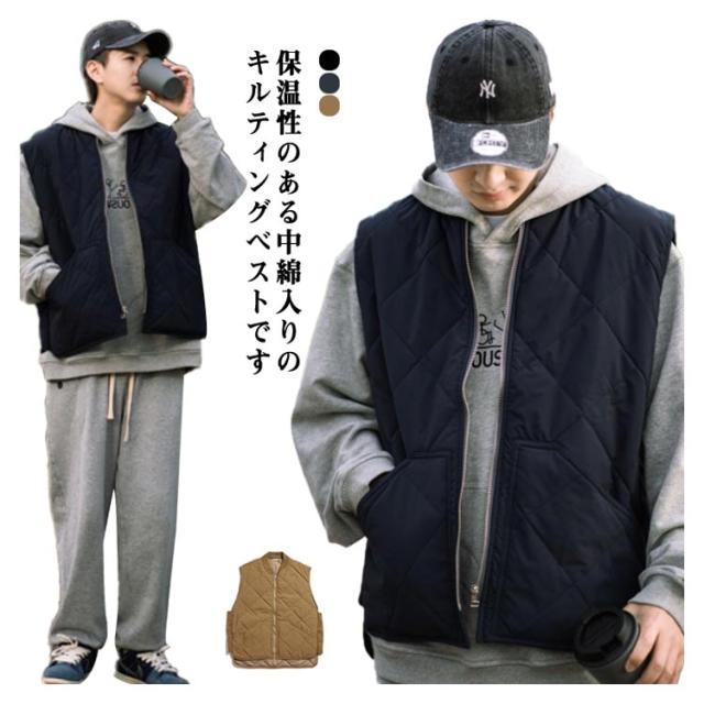 中綿ベスト メンズ トップス ノースリーブ アウター 暖かい 秋冬 無地 シンプル キルティングベスト ベスト ポケット付き 前開き 前後差 ジップアップ カジュアル 保温 防寒対策 レイヤード ミドル丈 小襟 ブラック ダークブルー ブラウン 送料無料