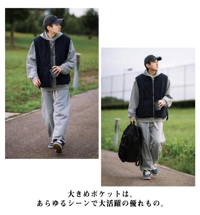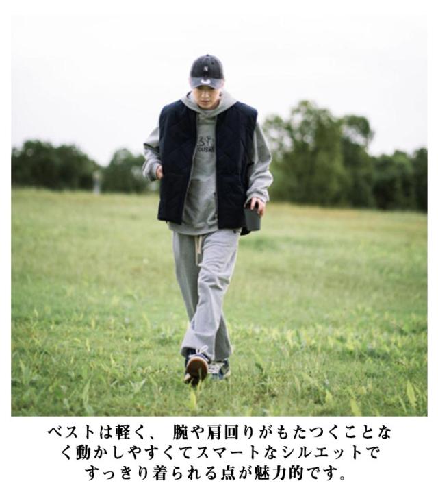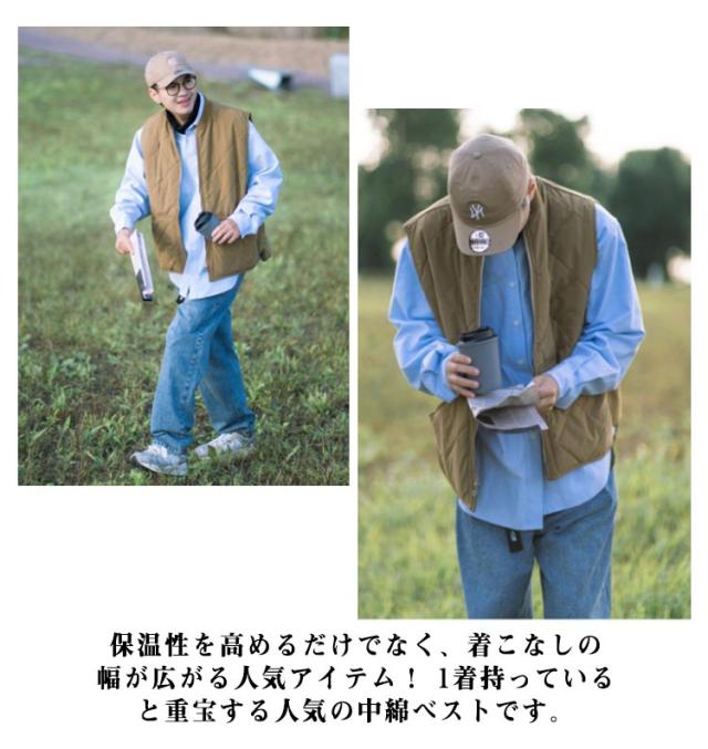 | 保温性のある中綿入りのキルティングベストです 。 身幅の広いシルエットで、アウターとしてラフな着こなしに向いています。 大きめポケットは、あらゆるシーンで大活躍の優れもの。 ベストは軽く、 腕や肩回りがもたつくことなく動かしやすくてスマートなシルエットですっきり着られる点が魅力的です。 保温性を高めるだけでなく、着こなしの幅が広がる人気アイテム! 1着持っていると重宝する人気の中綿ベストです。 | |