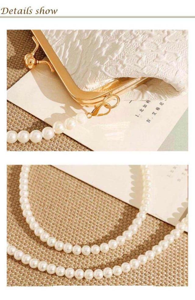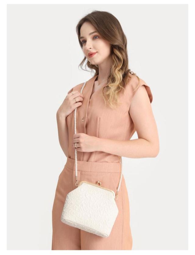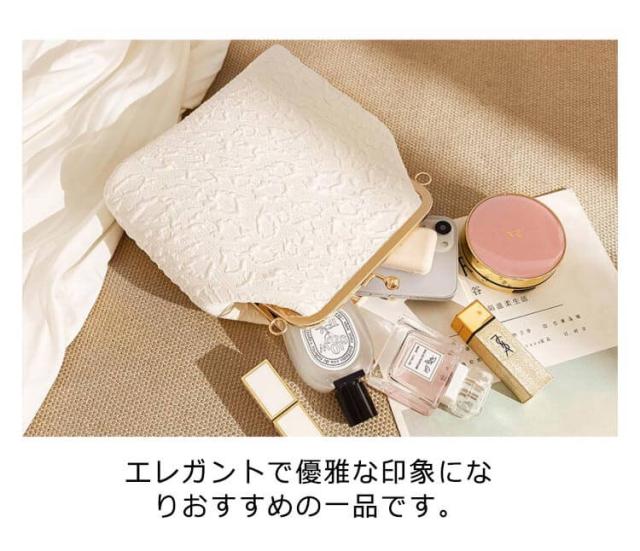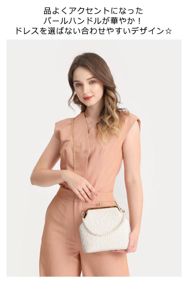 | 高級感のあるエンボスレースに、デザインパールハンドルがオシャレなクラッチバッグ。 品よくアクセントになったパールハンドルが華やか!ドレスを選ばない合わせやすいデザイン☆ ロングとショートの2本のチェーンが付属されてるので、シーンに合わせて、手持ちスタイルでもショルダースタイルでもお使いいただけます。 スマホや財布、ふくさまで入る安心のサイズ感。それでいてスッキリとしたフォルムがうれしい! エレガントで優雅な印象になりおすすめの一品です。 結婚式や披露宴、2次会にはもちろんお食事会や謝恩会など活躍の場がたくさん◎ | |