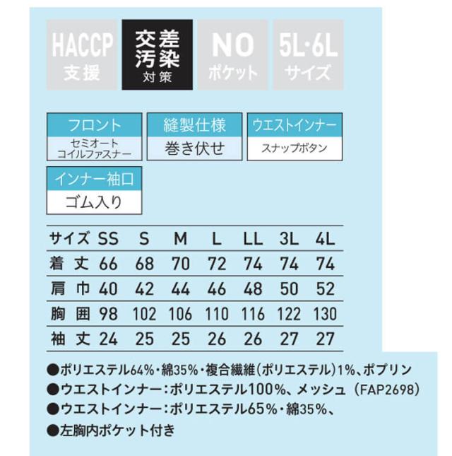 食品工場白衣 半袖ジャンパー FA2698 男女兼用 サーヴォ SERVO フードファクトリー 常温作業向け 制服 ユニフォーム