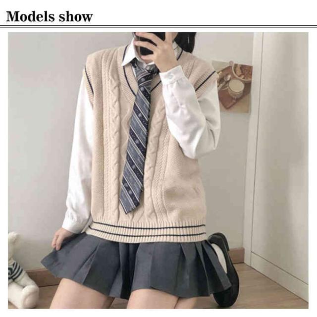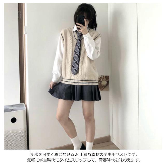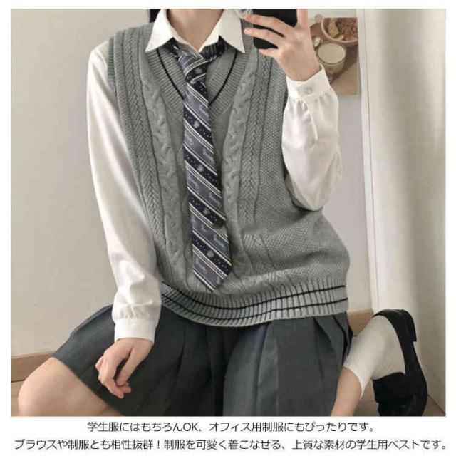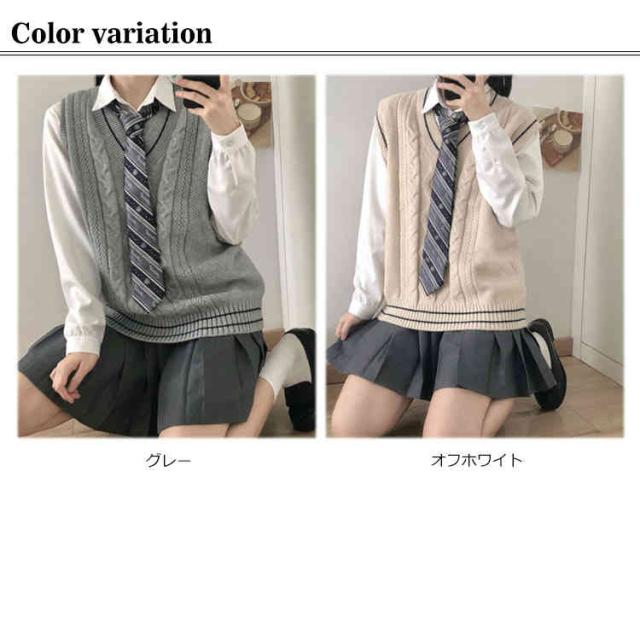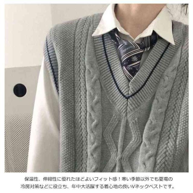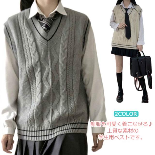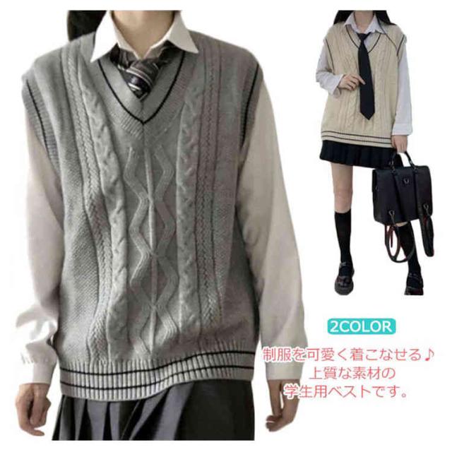 ライン入り Vネックニットベスト 綿 スクールベスト 無地 ゆったり ケーブル編み ニット ベスト チョッキ 男女兼用 秋冬 春夏 スクールセーター 制服 学生服 男子 女子 高校生 中学生 通学 ベージュ グレー