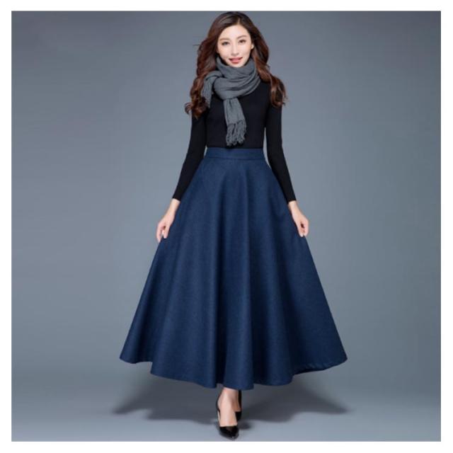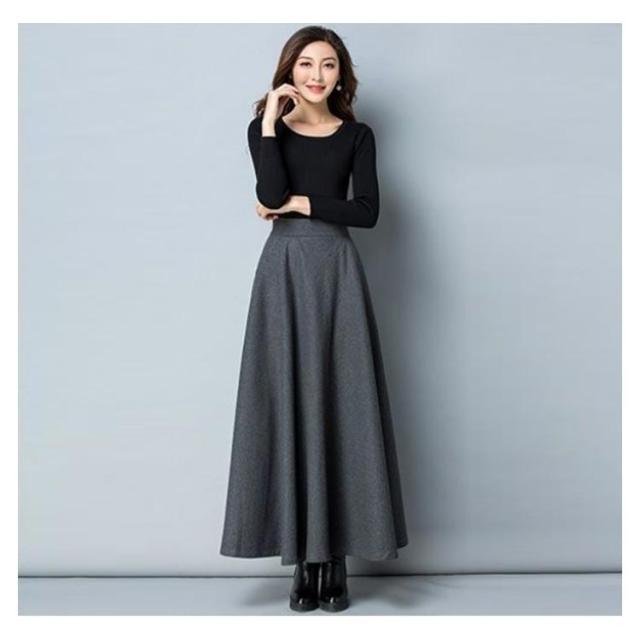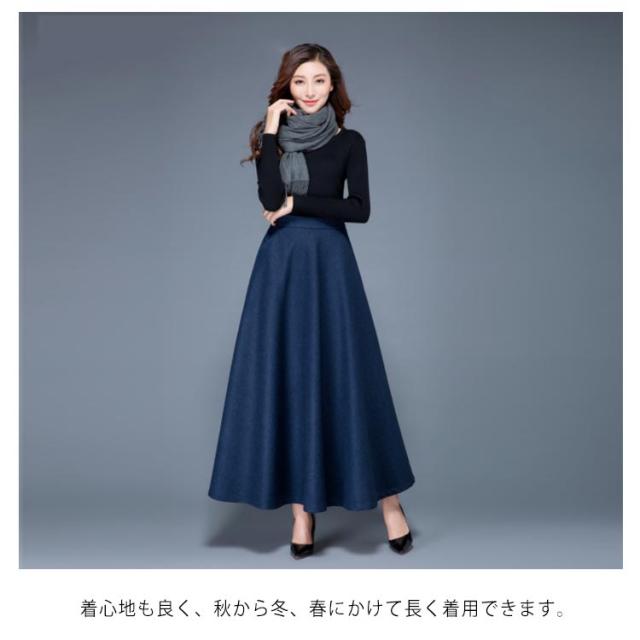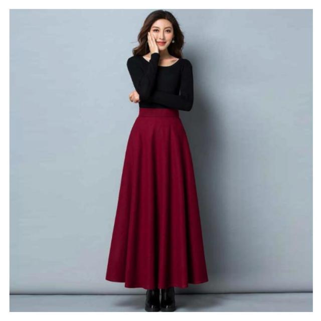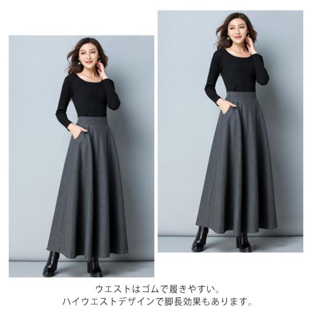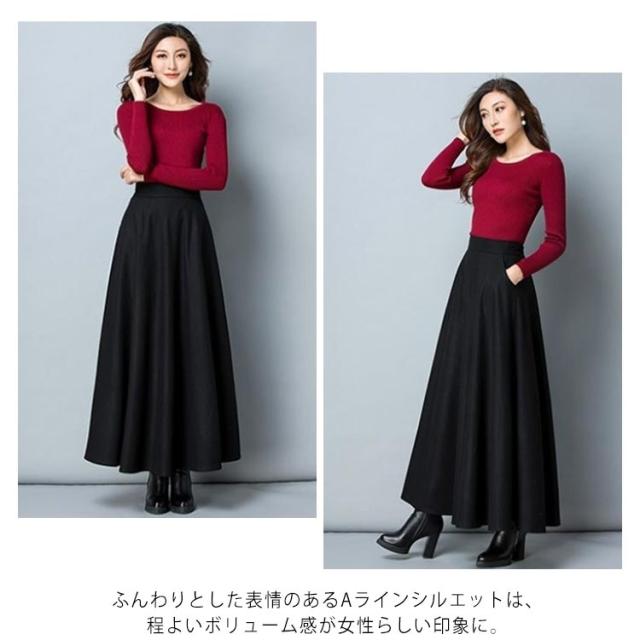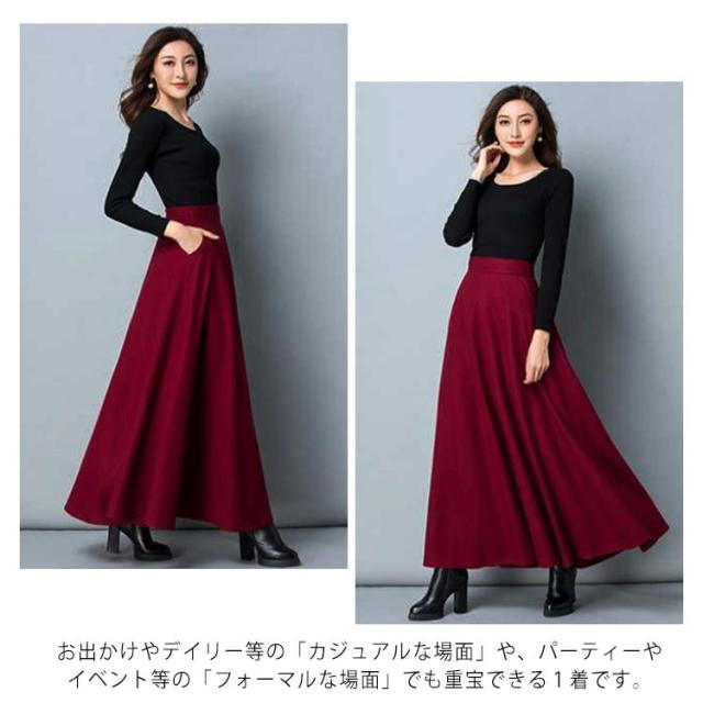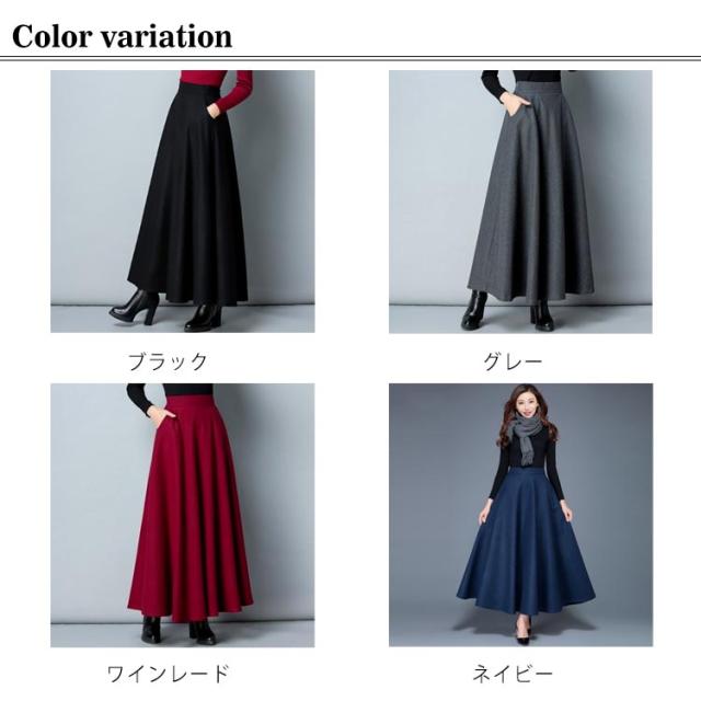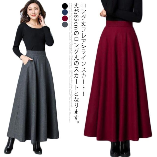 レディース スカート ロングスカート フレアスカート ウール ウエストゴム Aライン フレア ボトムス ロング丈 冬 体型カバー 大人 女性 大きいサイズ あったか 無地 ポケット付き きれいめ シンプル おしゃれ 黒 ブラック ワインレッド オフィス カジュアル 秋冬