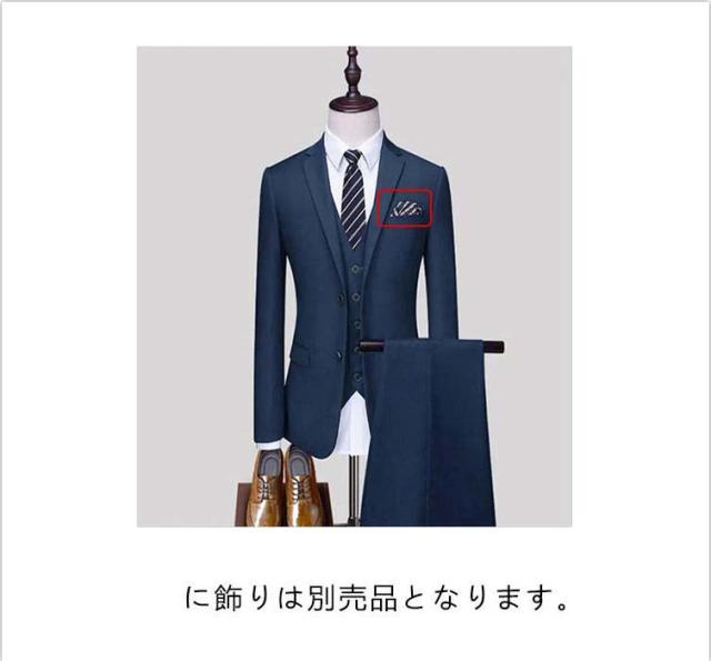 | サイズについての説明 | 3点セット:ベスト+スラックス+ジャケット(ネクタイは別売りです。) ジャケット: バスト 総丈 袖丈 おすすめ体重 S 38.5cm 87cm 62cm 58cm 47.5kg M 39.5cm 88.5cm 65cm 60cm 47.5-52.5kg L 40cm 94cm 67.5cm 62.5cm 52.5-60kg 2L 41.5cm 98cm 69cm 63cm 60-67.5kg 3L 43cm 102cm 71cm 66cm 67.5-75kg 4L 43.5cm 104cm 72.5cm 67cm 75-82.5kg 5L 45cm 110cm 74cm 67cm 82.5-90kg 6L 46.5cm 112cm 77cm 68.5cm 90-97.5kg スラックス:総丈 ウエスト ヒップ おすすめ体重 S 100cm 80cm 95cm 47.5kg M 102cm 81cm 97cm 47.5-52.5kg L 104cm 83cm 101cm 52.5-60kg 2L 106cm 86cm 102cm 60-67.5kg 3L 109cm 88cm 106cm 67.5-75kg 4L 110cm 92cm 109cm 75-82.5kg 5L 115cm 94cm 111cm 82.5-90kg 6L 115cm 98cm 113cm 90-97.5kg ベスト:肩幅 バスト 後ろ長さ 前長さ おすすめ体重 S 31cm 84cm 51cm 59cm 47.5kg M 33.5cm 88cm 53cm 61cm 47.5-52.5kg L 33.5cm 92cm 55cm 63cm 52.5-60kg 2L 35cm 96cm 57cm 64.5cm 60-67.5kg 3L 36cm 100c |