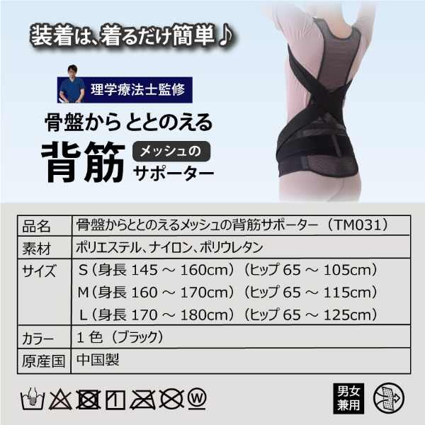 理学療法士監修!着るだけ背筋が伸びて骨盤を引き締める男女兼用サポーター!■ポイント[1]たすき掛けのベルトが肩甲骨を引き寄せ、正しい姿勢をサポート。■ポイント[2]スライドベルトが背筋を好みの強度で伸ばします。肩紐部分が抜け落ちない仕様で安心してご使用いただけます。■ポイント[3]二重ベルト付き骨盤ベルトが骨盤を引き締め安定させます。体幹を安定させて姿勢も美しくサポート。猫背や肩こり、下腹ぽっこりにお悩みの方におすすめです。薄手のメッシュ素材なので蒸れにくく、サポーターの上に服を着ても目立ちません。