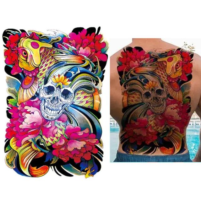 背中に貼れる大きなサイズのカラフルにカラーリングされた魚の鯉やお花やドクロをモチーフにした水で貼るフェイクタトゥ—ステッカー。