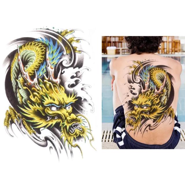 背中に貼れる大きなサイズの黄色イエローにカラフルにカラーリングされたドラゴンをモチーフにした水で貼るフェイクタトゥ—ステッカー。