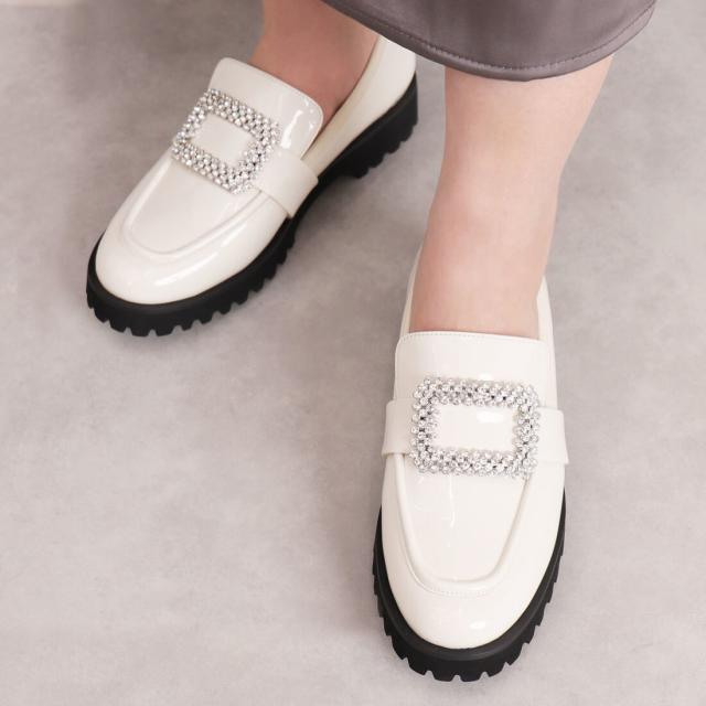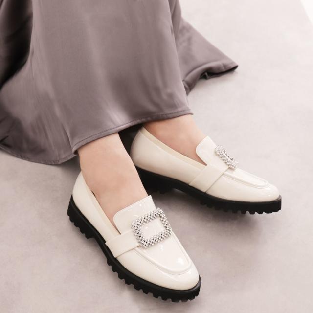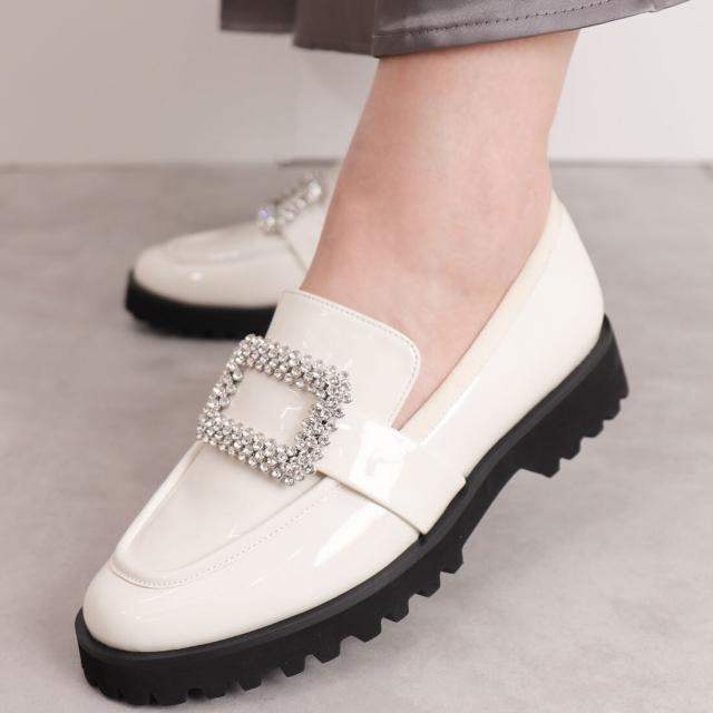 スクエアのビジューバックルが目を引く厚底ローファー。