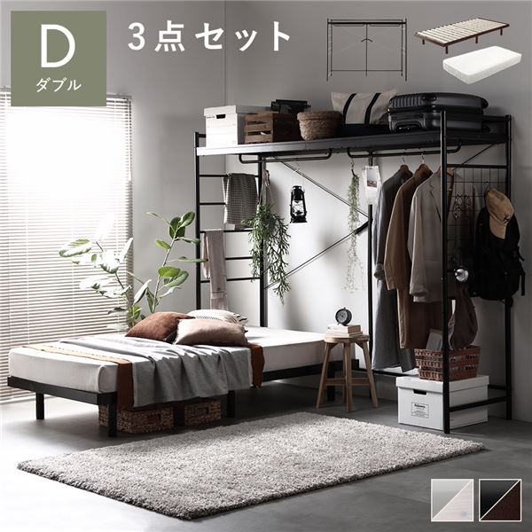 ■3点セット(ハンガーラック+ベッドフレーム+マットレス) ダブルサイズ ハンガーラック:ホワイト/ベッドフレーム:ホワイトウォッシュ
