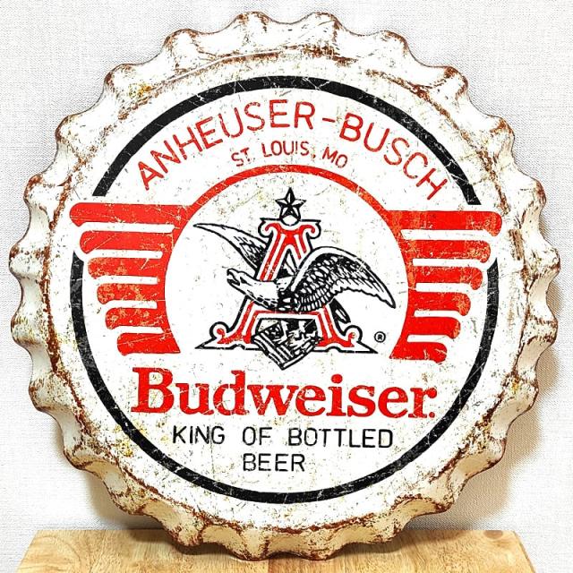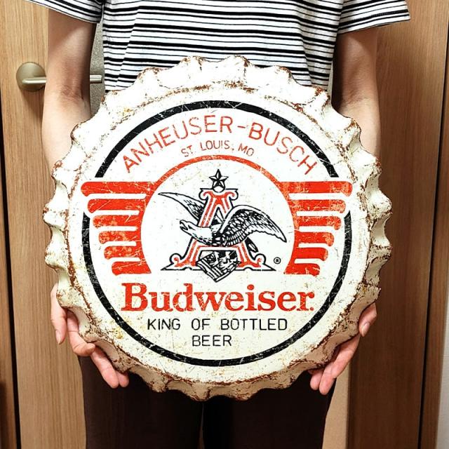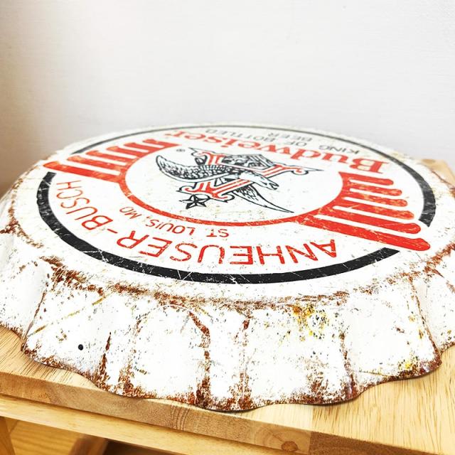 バドワイザーのボトルキャップ型のレトロでおしゃれなブリキ看板です!
