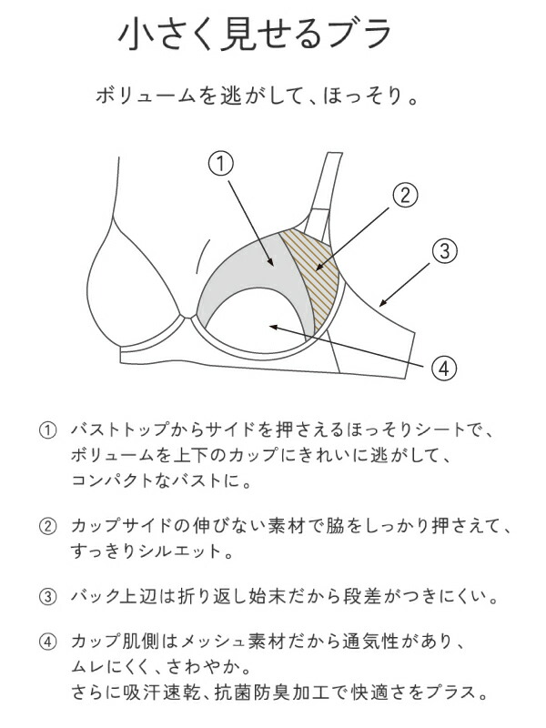 バストの突出をおさえ、トップの周径を効率的に減らすことで、着やせ効果のあるブラジャー