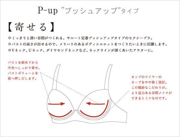 バストボリュームを脇から中央に寄せ、きれいな谷間をつくるプッシュアップタイプ