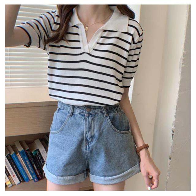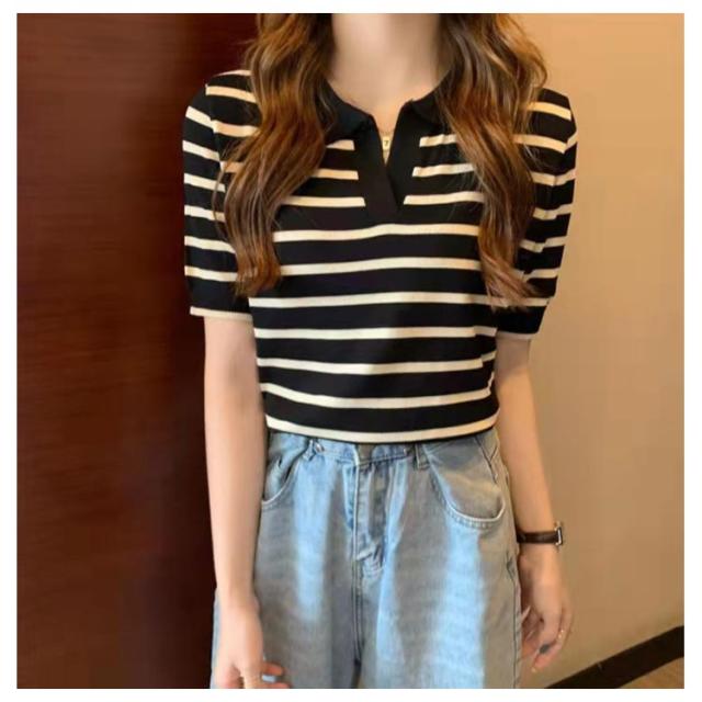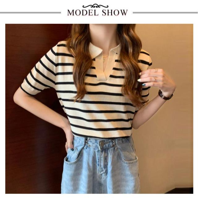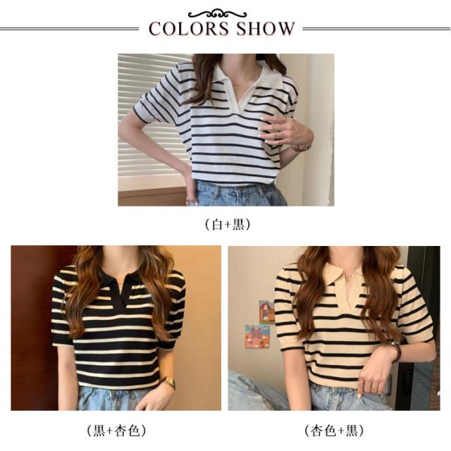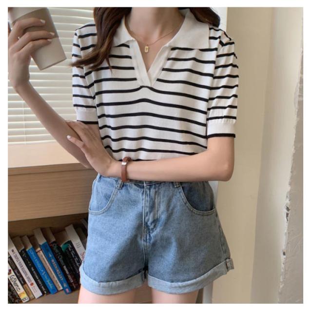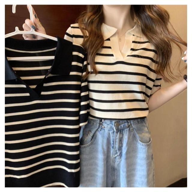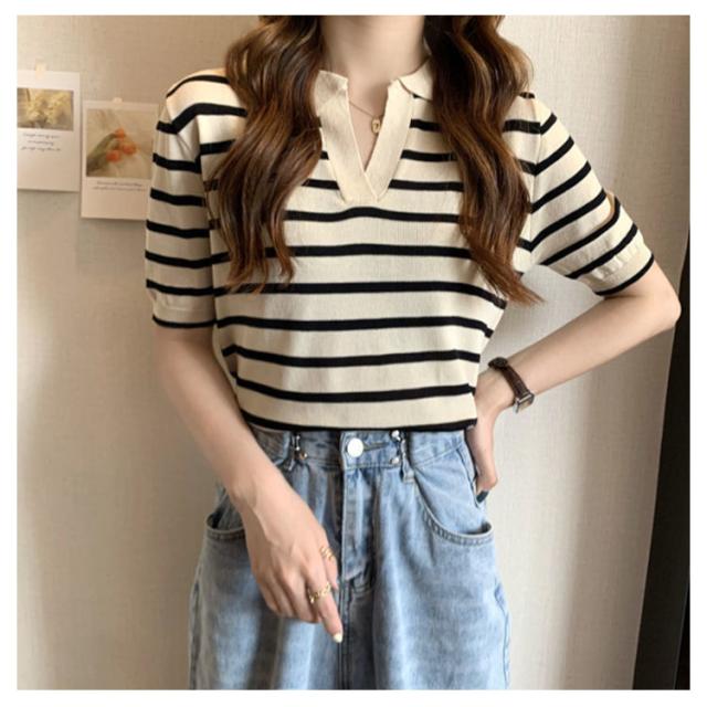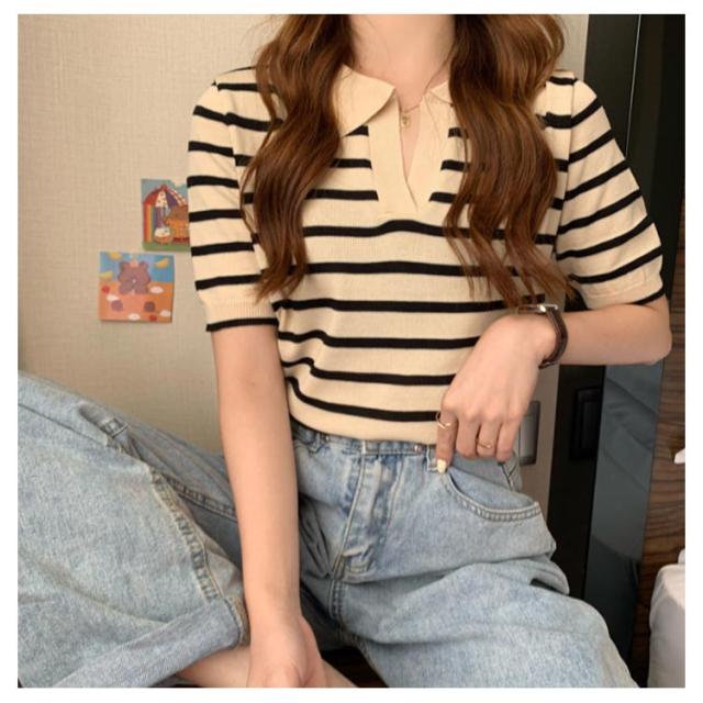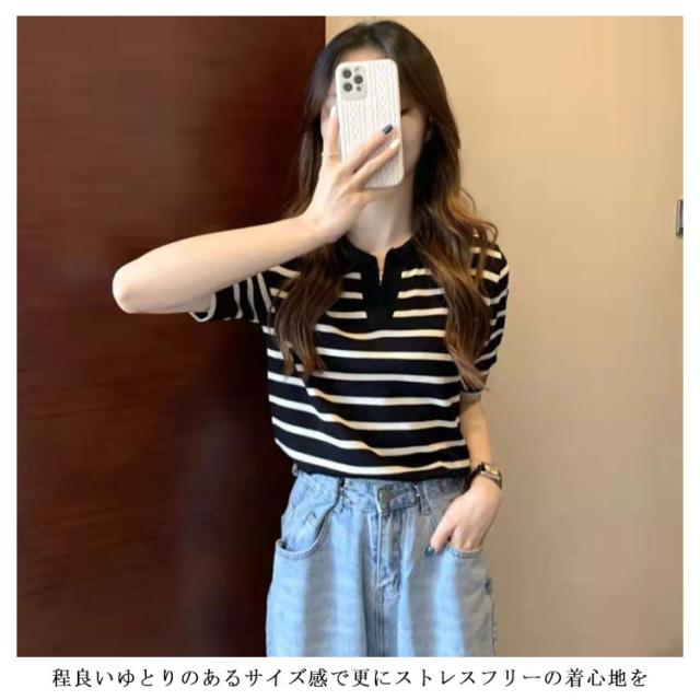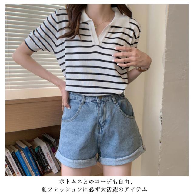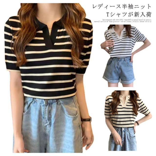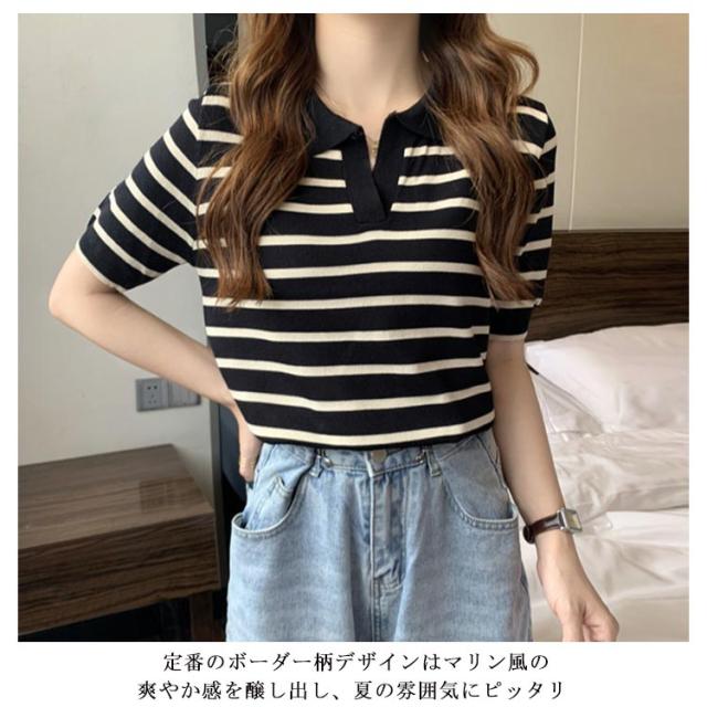 Tシャツ レディース ボーダー柄 ポロシャツ 半袖 ニットTシャツ 薄手 サマーニット ゆったり 半袖Tシャツ ボーダー柄Tシャツ マリンセーラー 夏 送料無料