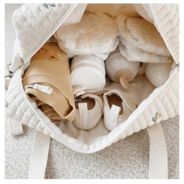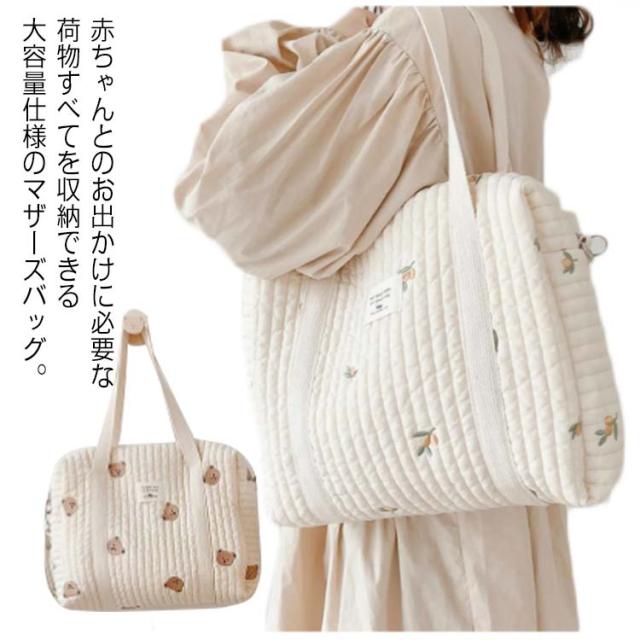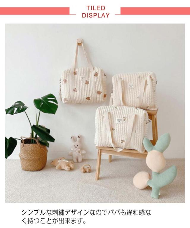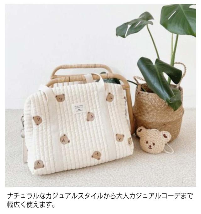 | 赤ちゃんとのお出かけに必要な荷物すべてを収納できる大容量仕様のマザーズバッグ。 軽量のキルティング生地のため見た目より軽くデイリーユースに最適です。 A4サイズ対応で、ショルダーベルト付きの2way仕様なので、通勤バッグとしてもOK! バッグ口は大きく開くので、荷物が取り出しやすく使い勝手も抜群です。 シンプルな刺繍デザインなのでパパも違和感なく持つことが出来ます。 ナチュラルなカジュアルスタイルから大人カジュアルコーデまで幅広く使えます。 | |