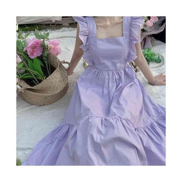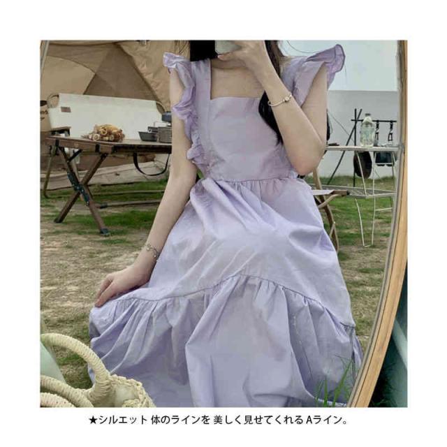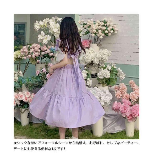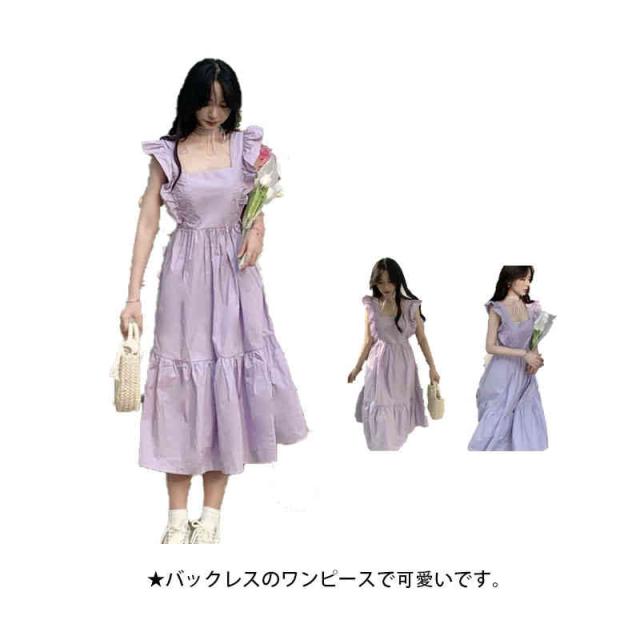 ワンピース キャミワンピース バックレス リボン 肩フリル ノースリーブ フレアワンピース 袖なし ゆったり 着痩せ ファッション ロング ハイウエスト 無地 夏 レディース