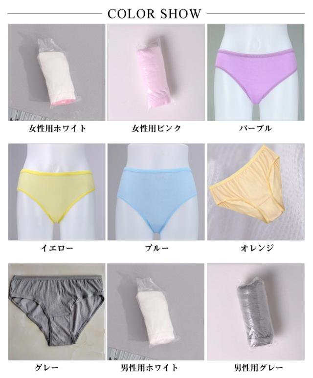 | メンズ&レディース用の使い捨てショーツ、同色5枚セットです。 国内海外旅行、出張など、あらゆる場面で活躍してくれる。 捨てて帰ってこられるので、手荷物にならず便利です。 自分用にも、急に泊りに来た友人用にも買い置きがあると便利です。 | |
