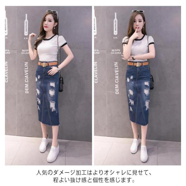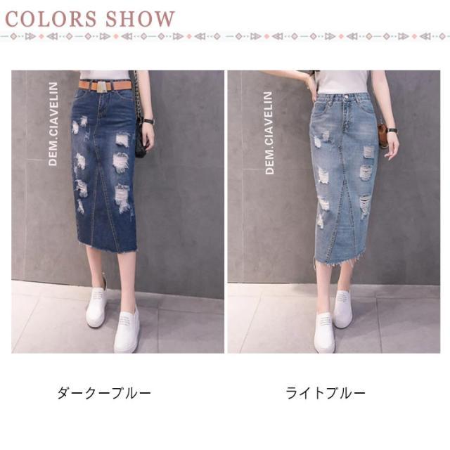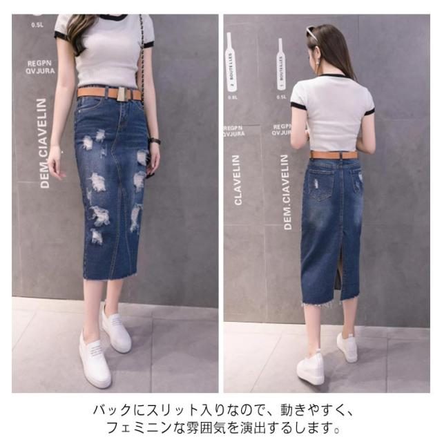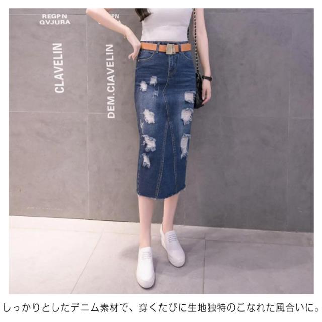 デニムスカート レディース スリム ロング丈 スカート スリット入り ダメージ加工 ボトムス ミモレスカート おしゃれ ハイウェスト 可愛い 春物 お洒落