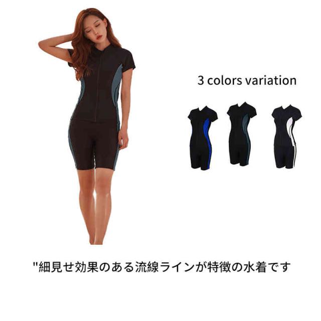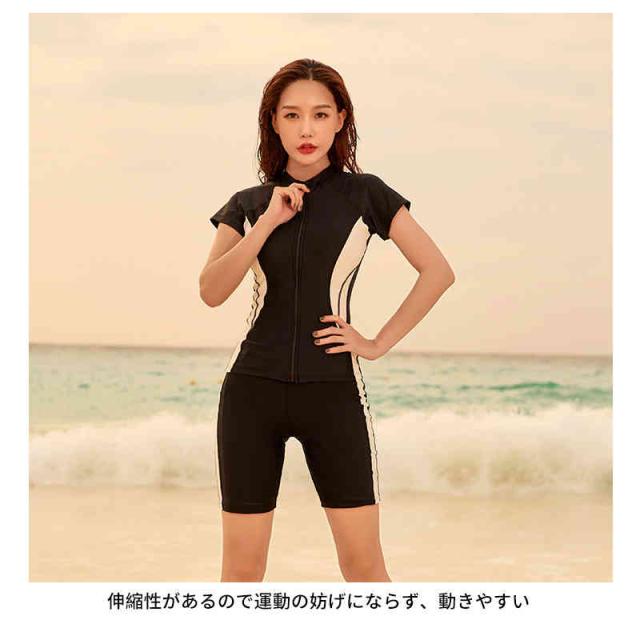 | 細見せ効果のある流線ラインが特徴の水着です 伸縮性があるので運動の妨げにならず、動きやすい 着脱しやすく着替えやすいのもセパレートの嬉しいポイント 二の腕も安心の半袖と、ハイウエストボトムでお腹もしっかりカバー スポーツでも遊びでも色んなシーンで使えるように着心地にもこだわりました | |