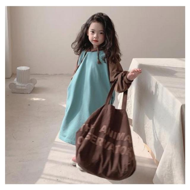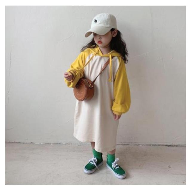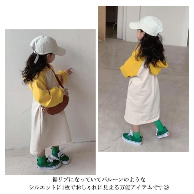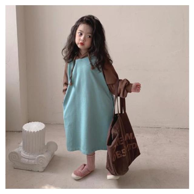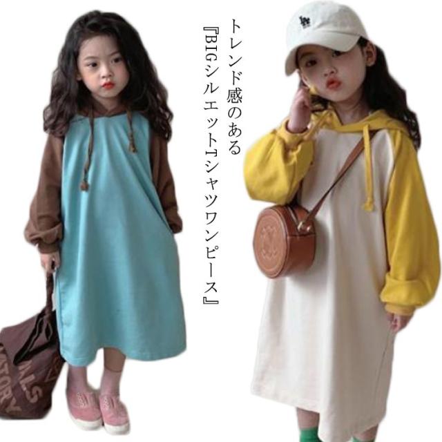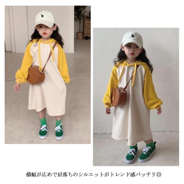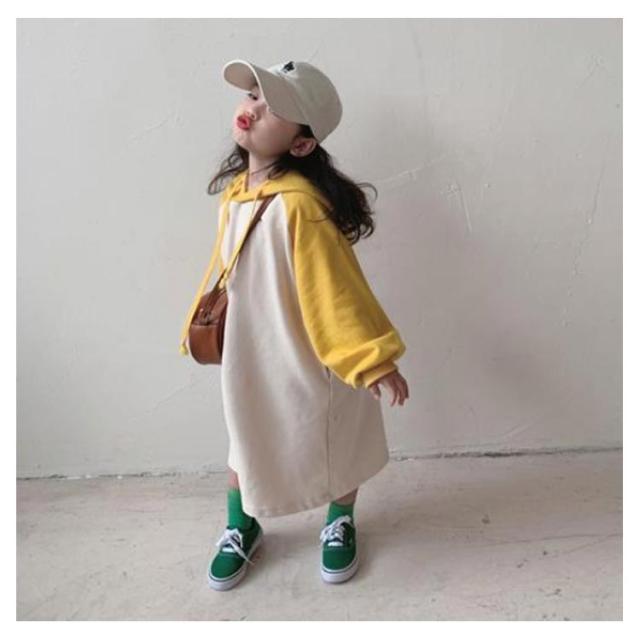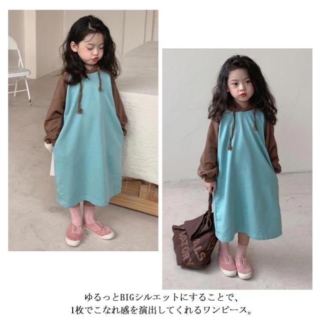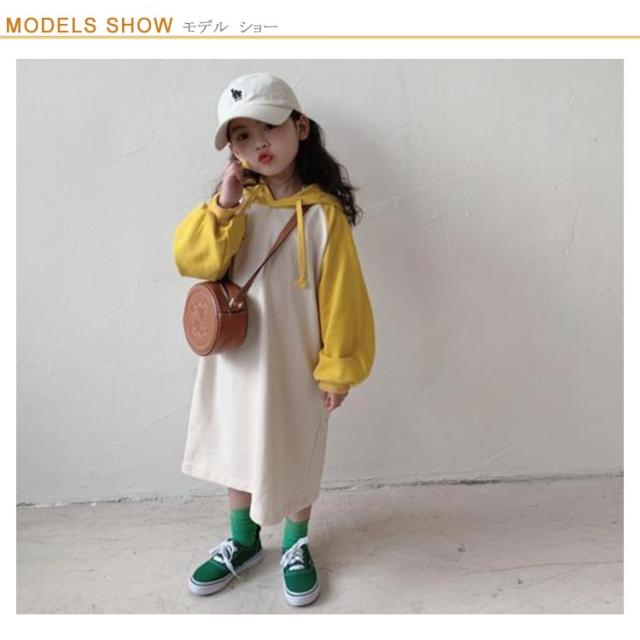 【送料無料】キッズ カットソー tシャツ ロング 長袖 Tシャツワンピース ワンピース パーカーワンピース 配色 女の子 フード付き 薄手 韓国 子供服 春 夏 秋 90 100 110 120 130 140 cm かわいい
