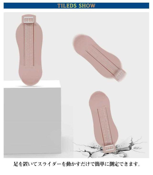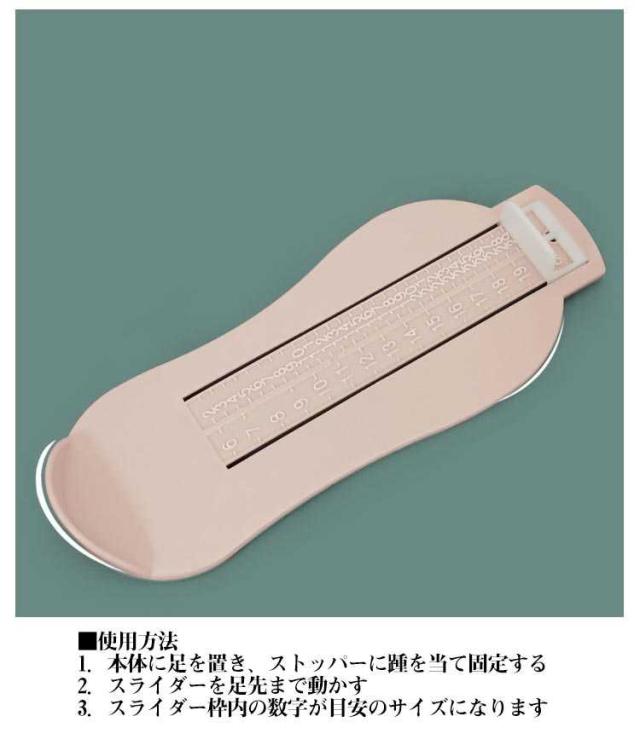 | 簡単にお子様の足の計測が出来るフットメジャー 足を置いてスライダーを動かすだけで簡単に測定できます。 ■使用方法 1.本体に足を置き、ストッパーに踵を当て固定する 2.スライダーを足先まで動かす 3.スライダー枠内の数字が目安のサイズになります | |