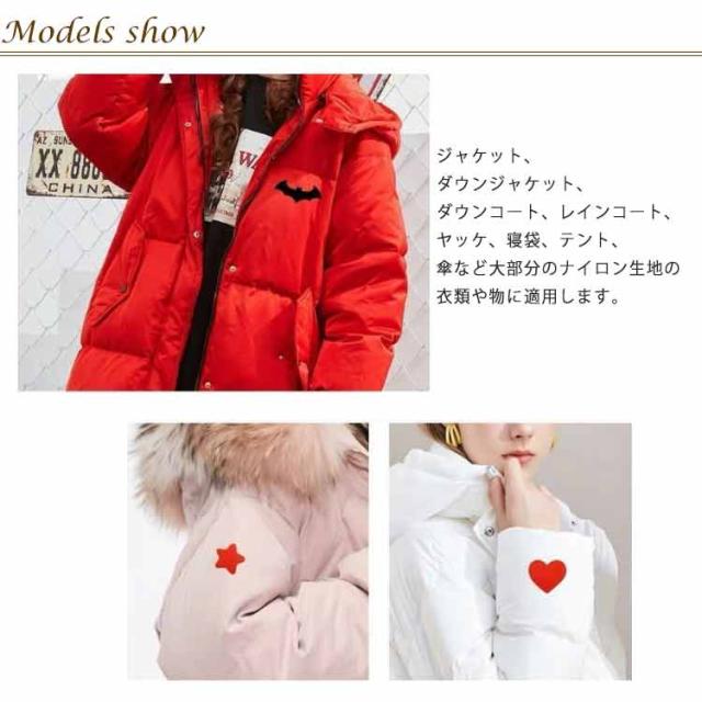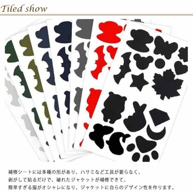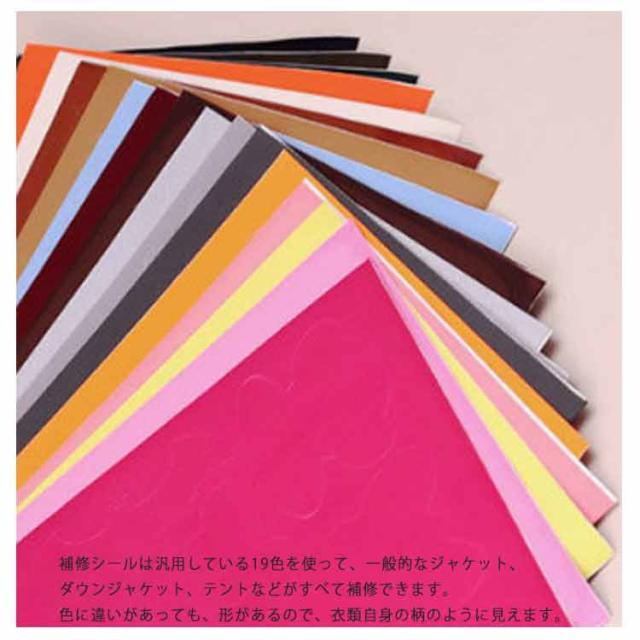 | ダウンジャケット用の補修用シートです。 補修シートには多種の形があり、ハサミなど工具が要らなく、剥がして貼るだけで、破れたジャケットが補修できて、簡単すぎる服がオシャレになり、ジャケットに自らのデザイン性を作ります。 補修シールは汎用している19色を使って、一般的なジャケット、ダウンジャケット、テントなどがすべて補修できます。色に違いがあっても、形があるので、衣類自身の柄のように見えます。 ナイロン用補修シートですので、光沢がなく、目立たない衣類用ナイロンにさらに撥水加工を施して、ダウンジャケットのお洗濯に影響がなく、雨が降っても安全安心できます。 ジャケット、ダウンジャケット、ダウンコート、レインコート、ヤッケ、寝袋、テント、傘など大部分のナイロン生地の衣類や物に適用します。 | |