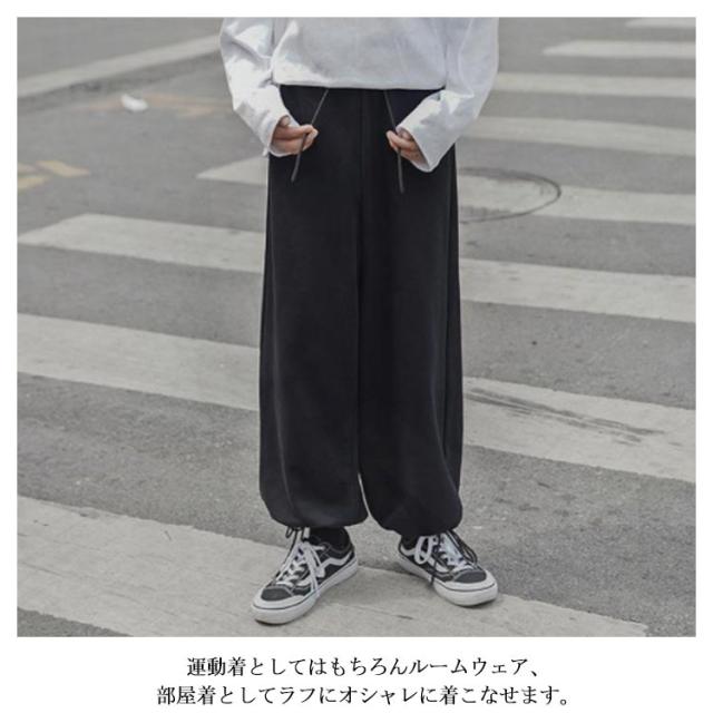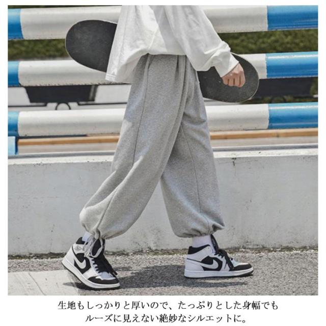 | トレンドの程よくワイドなシルエットがこなれ感のあるラフな着こなしに最適! 裾のドローコードを締めればバルーンパンツとしても活躍。 生地もしっかりと厚いので、たっぷりとした身幅でもルーズに見えない絶妙なシルエットに。 無地故の合わせ易さで、様々なスタイルにさっと馴染み気軽にカジュアルスタイルをお楽しみ頂けます。 運動着としてはもちろんルームウェア、部屋着としてラフにオシャレに着こなせます。 | |