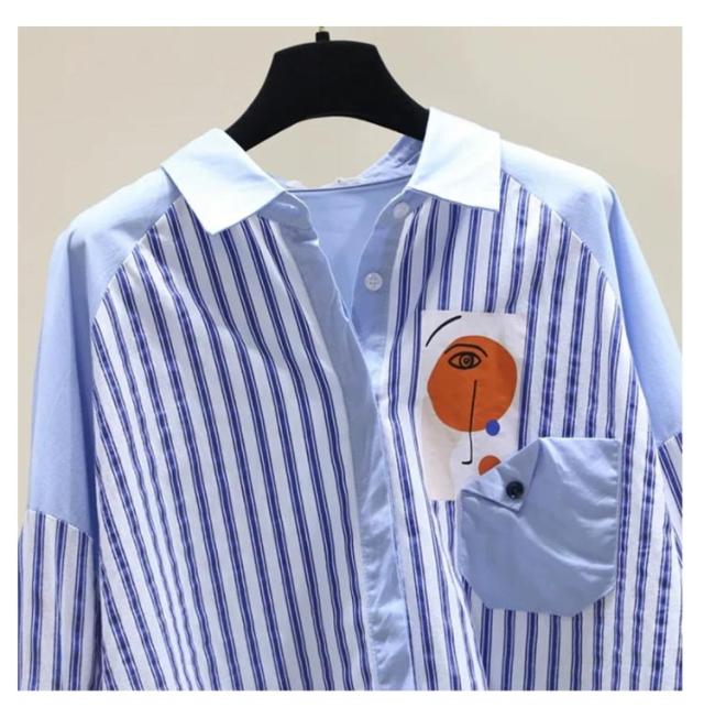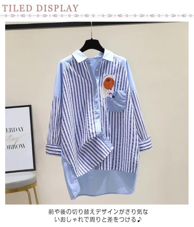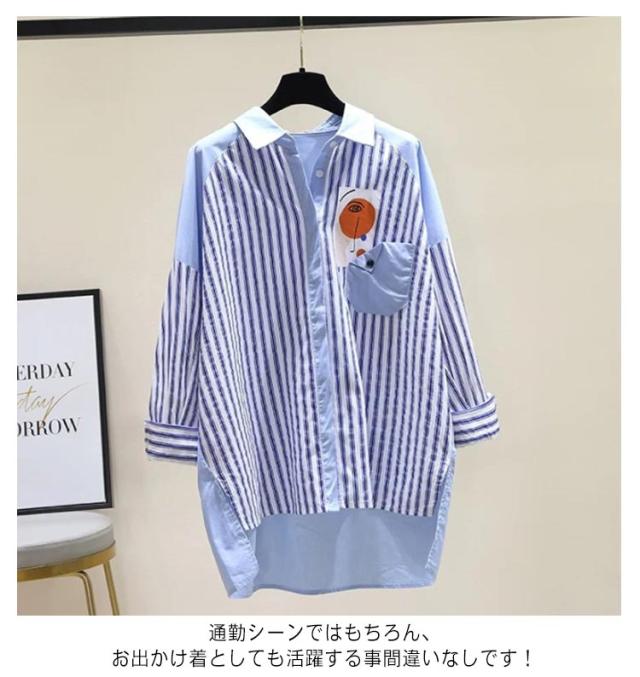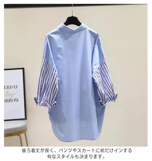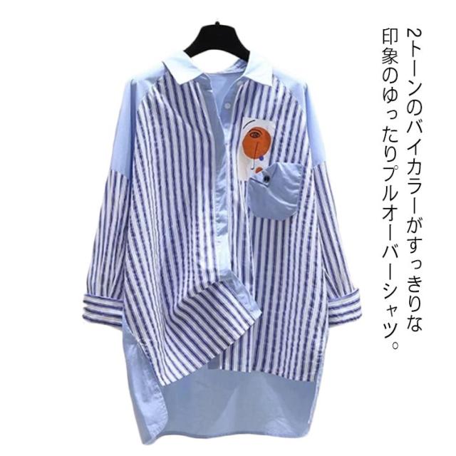 レディース 普段着 トップス ロング丈 ストライプ 長袖 ブラウス ゆったり バイカラー リラックス 通勤 切り替え 春秋 シャツ