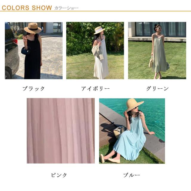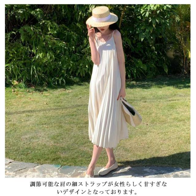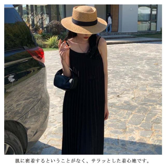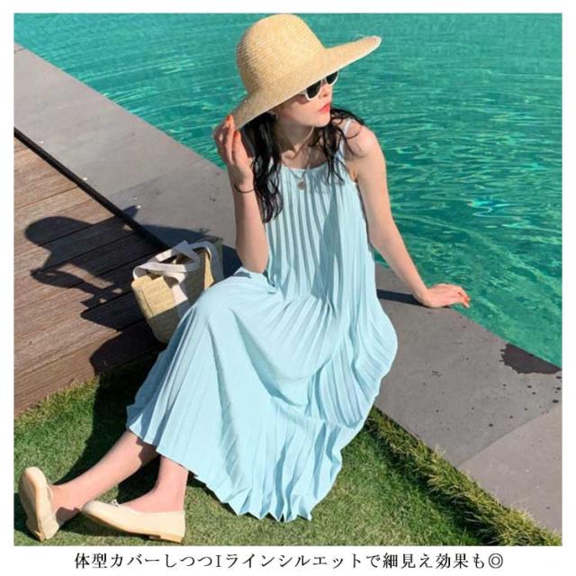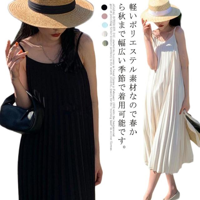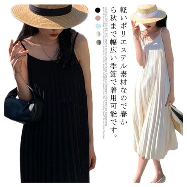 【送料無料】キャミワンピース プリーツ ロングワンピース たっぷり Iライン 韓国 レディース マタニティ ノースリーブ キャミワンピ スクエアネック ストラップ調節 可能 きれいめ かわいい 大きいサイズ