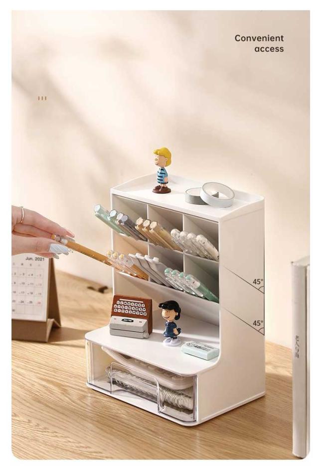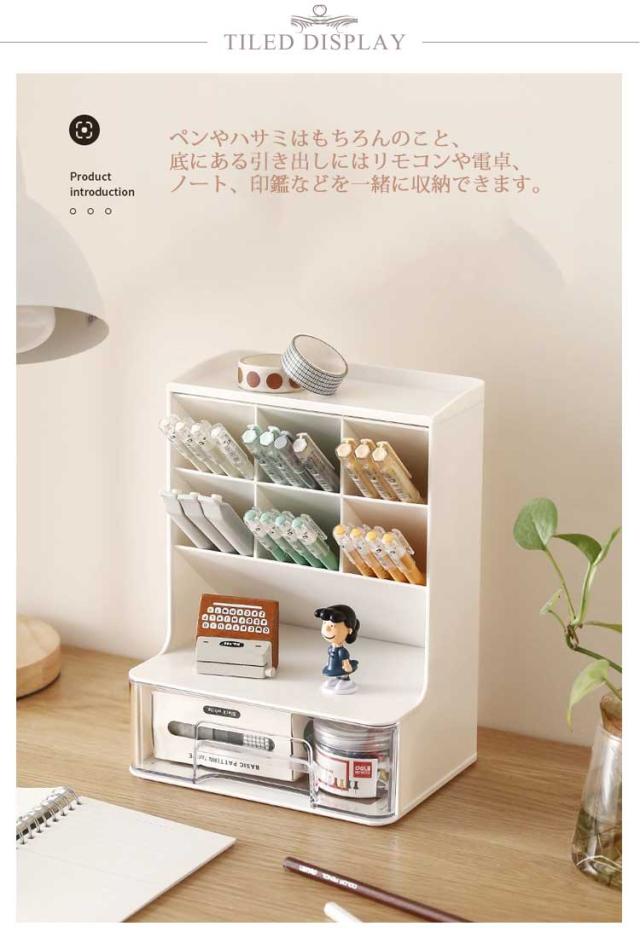 | デスク周りに散らかりがちな文房具をすっきり収納できるペンスタンド。 ペンやハサミはもちろんのこと、底にある引き出しにはリモコンや電卓、ノート、印鑑などを一緒に収納できます。 斜めについた仕切りでペンが取り出しやすいです。ペンやハサミ、付箋、メガネなどデスク周りの小物がきれいにまとまります。 文具以外にも、化粧品や化粧ブラシなどの小物収納ケースとしても良さそうです。 自宅のデスク周り、シンプルなフォルムだからオフィスにもオススメです。 | |