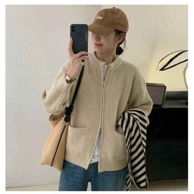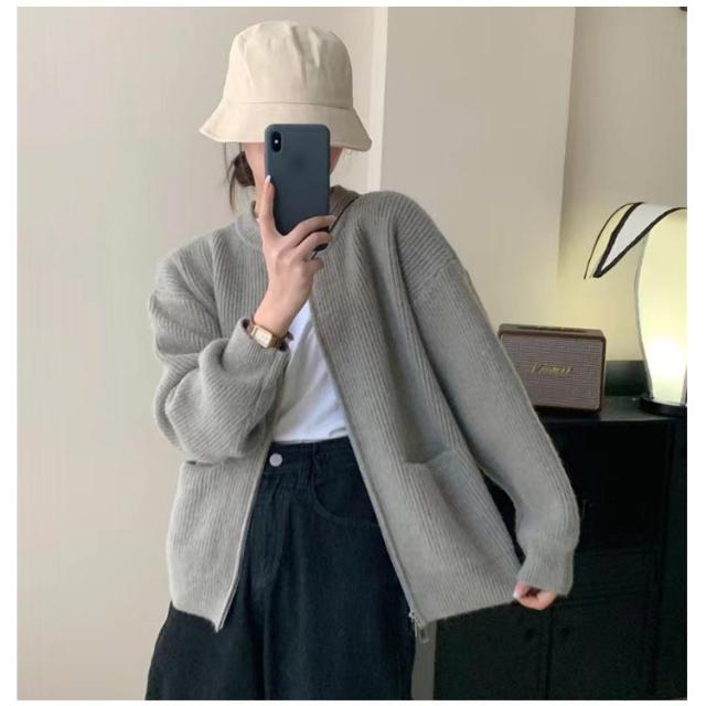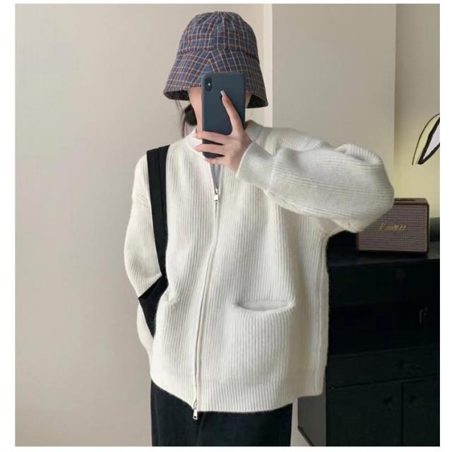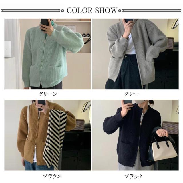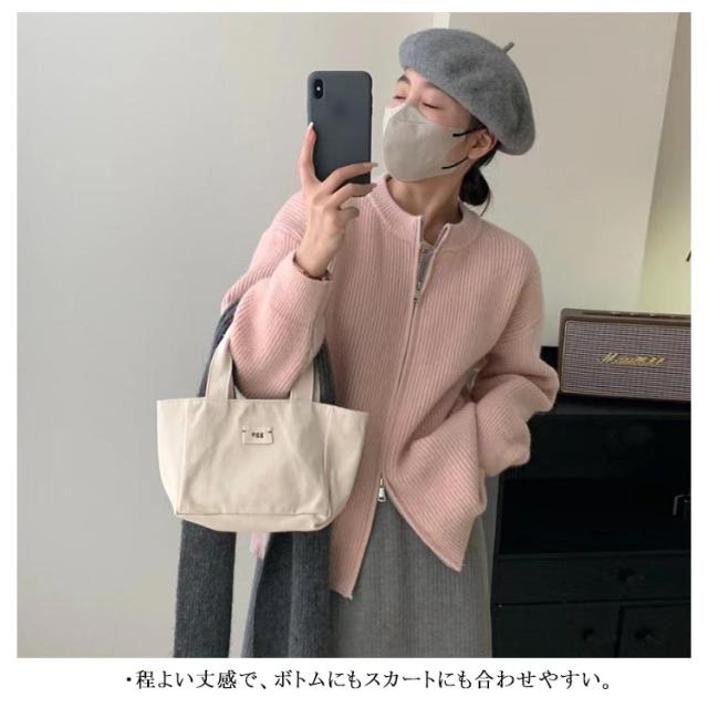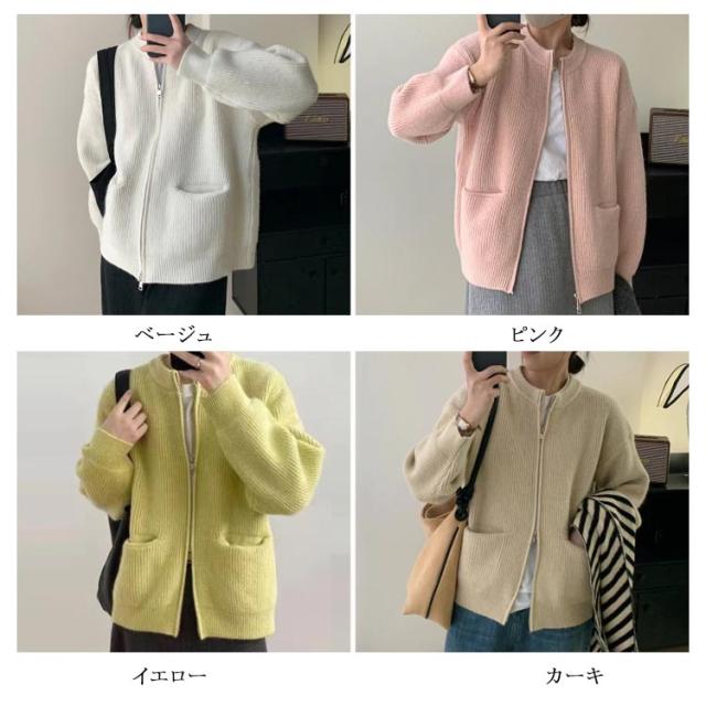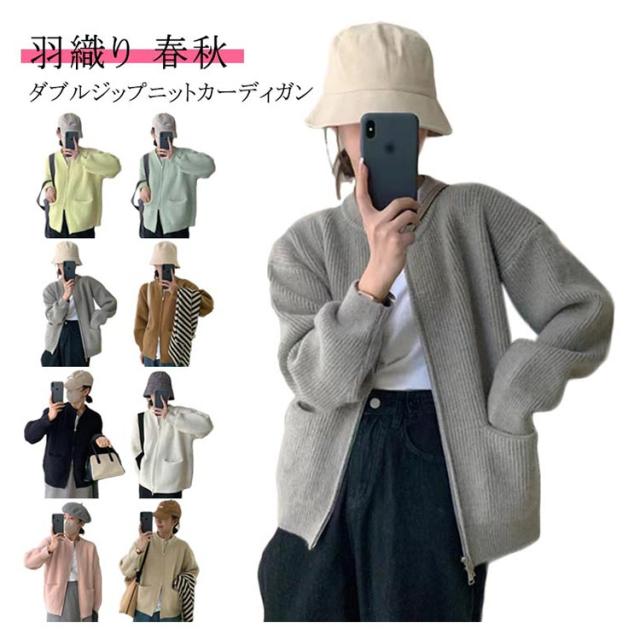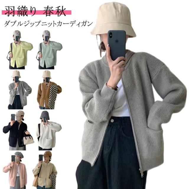 セーター クルーネック リブニット ジップアップ ポケット付き 春 ニット ダブルジッパーカーディガン ダブルファスナー 女性 カジュアル きれいめ 羽織り アウター ジャケット ニットカーディガン