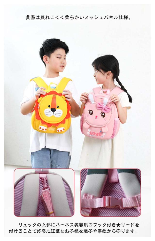 | 【商品名】キッズリュック 【サイズ】サイズ表 【素材】SBR素材 【特徴】 チェストストラップ付きなので肩からずり落ちない。 お子さんが持ちやすいサイズ感♪小さな子供向けのミニサイズリュック。 ダブルファスナー仕様&側面にはペットボトルを収納できるポケット付き。 背面は蒸れにくく柔らかいメッシュパネル仕様。 ショルダーベルトには反射テープ付きなので安全安心。夜間の視認性に役立ちます。 ショルダーベルトは長さ調節可能です。 メイン収納部分が大きく開くので荷物の出し入れが楽々。 SBR素材を使用し、耐摩耗性、耐老化性に優れています。 リュックの上部にハーネス装着用のフック付き★リードを付けることで好奇心旺盛なお子様を迷子や事故から守ります。 お出かけやお散歩にもぴったり!保育園や幼稚園の登園バッグとしても◎ | |